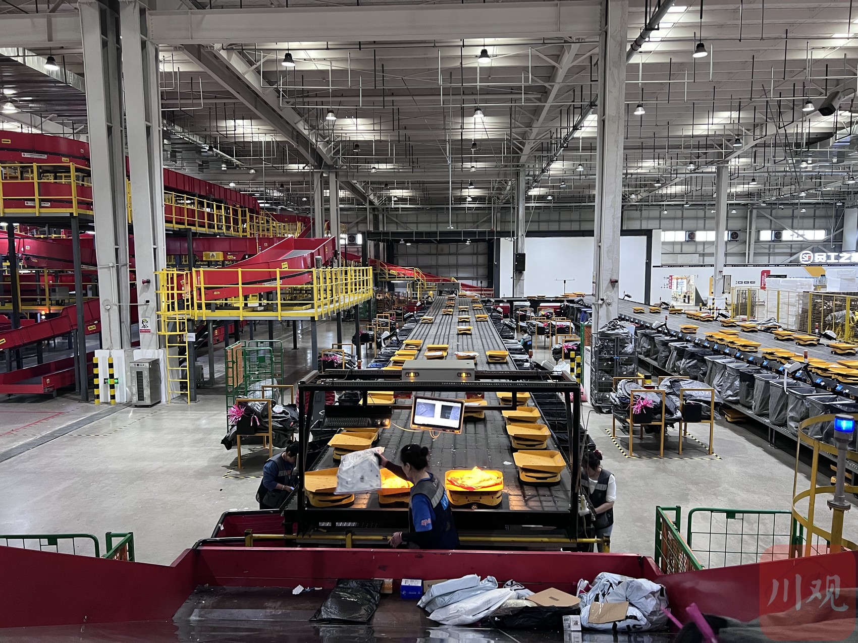 11日上午,记者来到成都市双流区的顺丰长兴转运中心,一件件快递包裹在智能化设备上快速流转,一辆辆运输快递包裹的大型货车在园区进进出出,现场一派繁忙的景象。