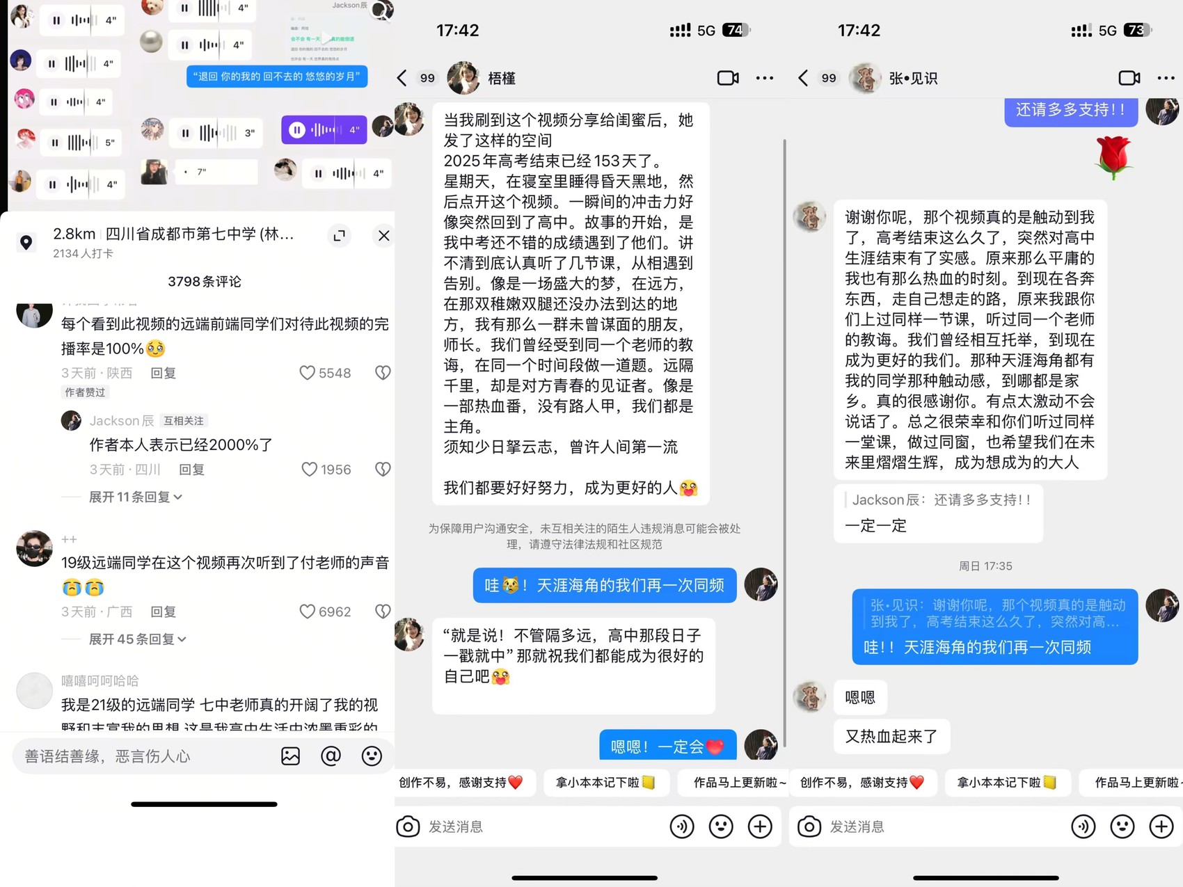 不少人还私信刘家辰,谈到“远隔千里,却是对方青春的见证者。像是一部热血番,没有路人甲,我们都是主角。”“那种天涯海角都有我的同学那种触动感,到哪都是家乡。”