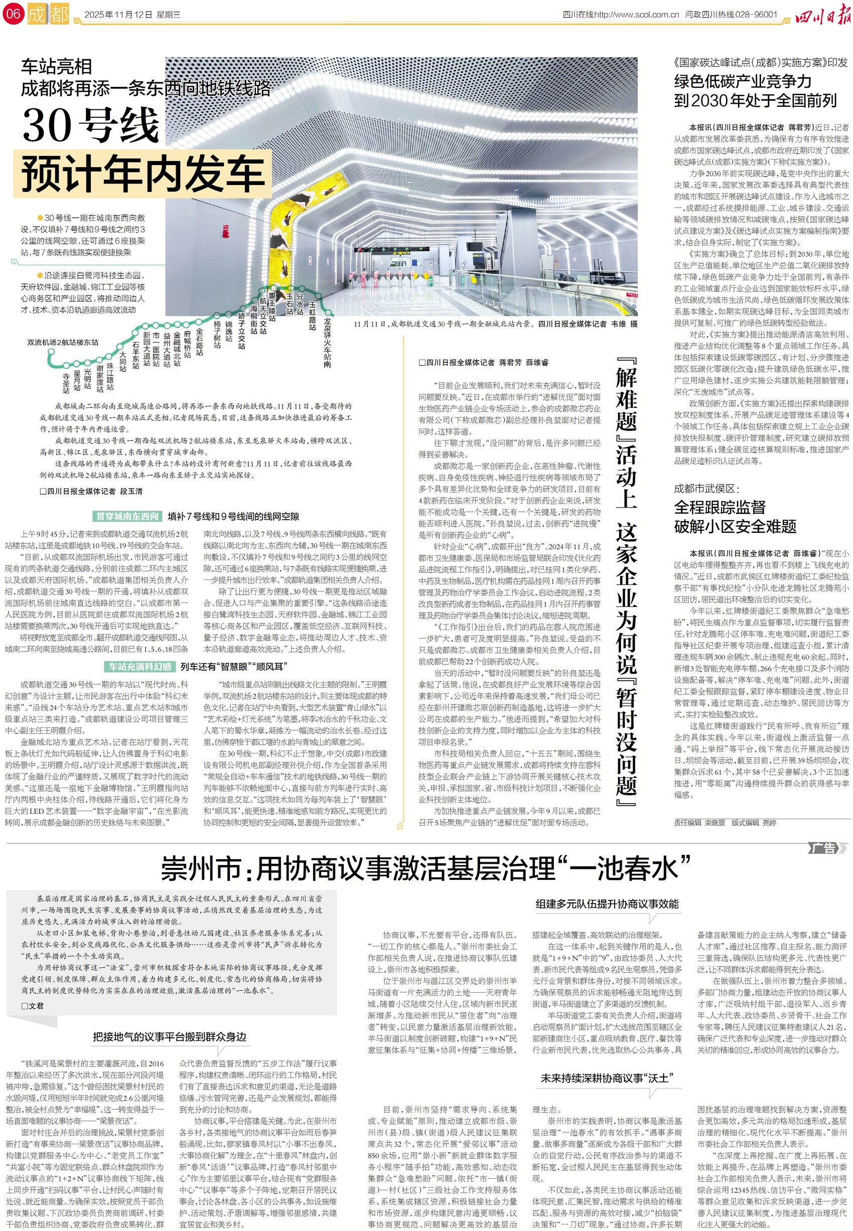 11月11日,成都轨道交通30号线一期车站正式亮相。这条东西向地铁线路正加快推进,预计年内开通运营。到时候,搭乘30号线,可以通过6座换乘站换乘7条既有线路,沿途经过白鹭湾科技生态园、天府软件园、金融城等核心商务区和产业园区,关注今日六版,跟随记者前往探访尝鲜。
