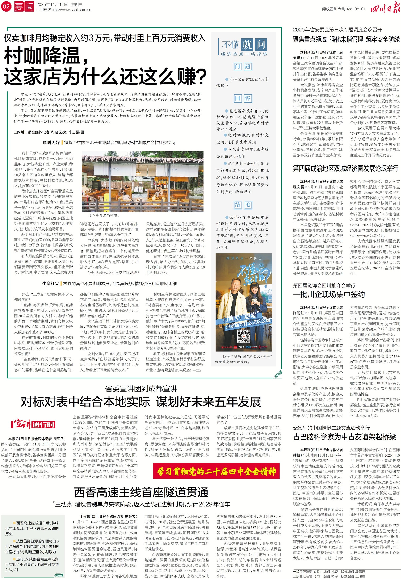 今年以来,曾经火遍全国的村咖开始降温,然而成都郫都区的“三农纪・田咖”逆势爆火,一天最多卖出几千杯咖啡,吸引3万多游客进村,带动上百万元消费。其成功的秘诀,就藏在“乡村+咖啡”的巧思里,比如搞韭菜咖啡、韭菜饺子,把乡村资源搬进店里;办艺术展、音乐会,卖体验和情绪价值。关注今日二版,解锁一家村咖的赚钱密码。