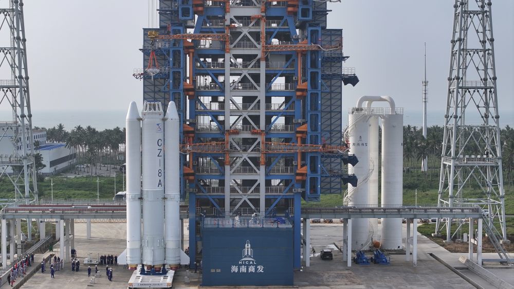 长八甲遥五火箭箭体转运至发射区一号发射工位(无人机照片)。新华社记者 陈凯姿 摄