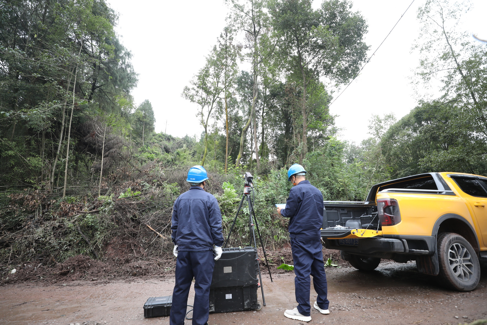 在蜿蜒的10千伏锣五线金鹅村支线下方,一处地形复杂区域,工作人员手持“远程激光炮”,对影响线路安全的树枝进行精准清理。这种激光清障仪无需登高作业,既规避了安全风险,也大幅提升清障效率。不远处,配电台区下方,一种形似“地毯”的新型防火材料正被快速铺设。工作人员介绍,这种水泥毯不受地形限制,只需铺平浇水,便能迅速硬化,有效隔绝火源,从源头“掐灭”山火隐患。