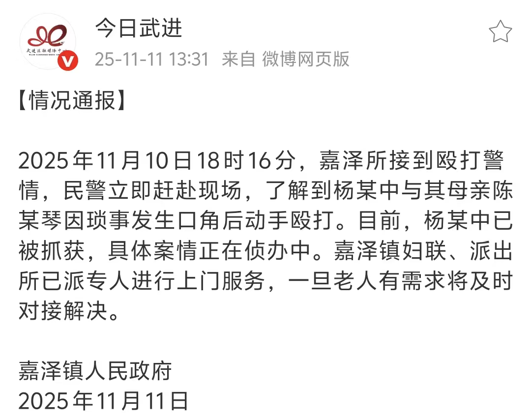 11日下午,武进区嘉泽镇人民政府通报:2025年11月10日18时16分,嘉泽所接到殴打警情,民警立即赶赴现场,了解到杨某中与其母亲陈某琴因琐事发生口角后动手殴打。目前,杨某中已被抓获,具体案情正在侦办中。嘉泽镇妇联、派出所已派专人进行上门服务,一旦老人有需求将及时对接解决。