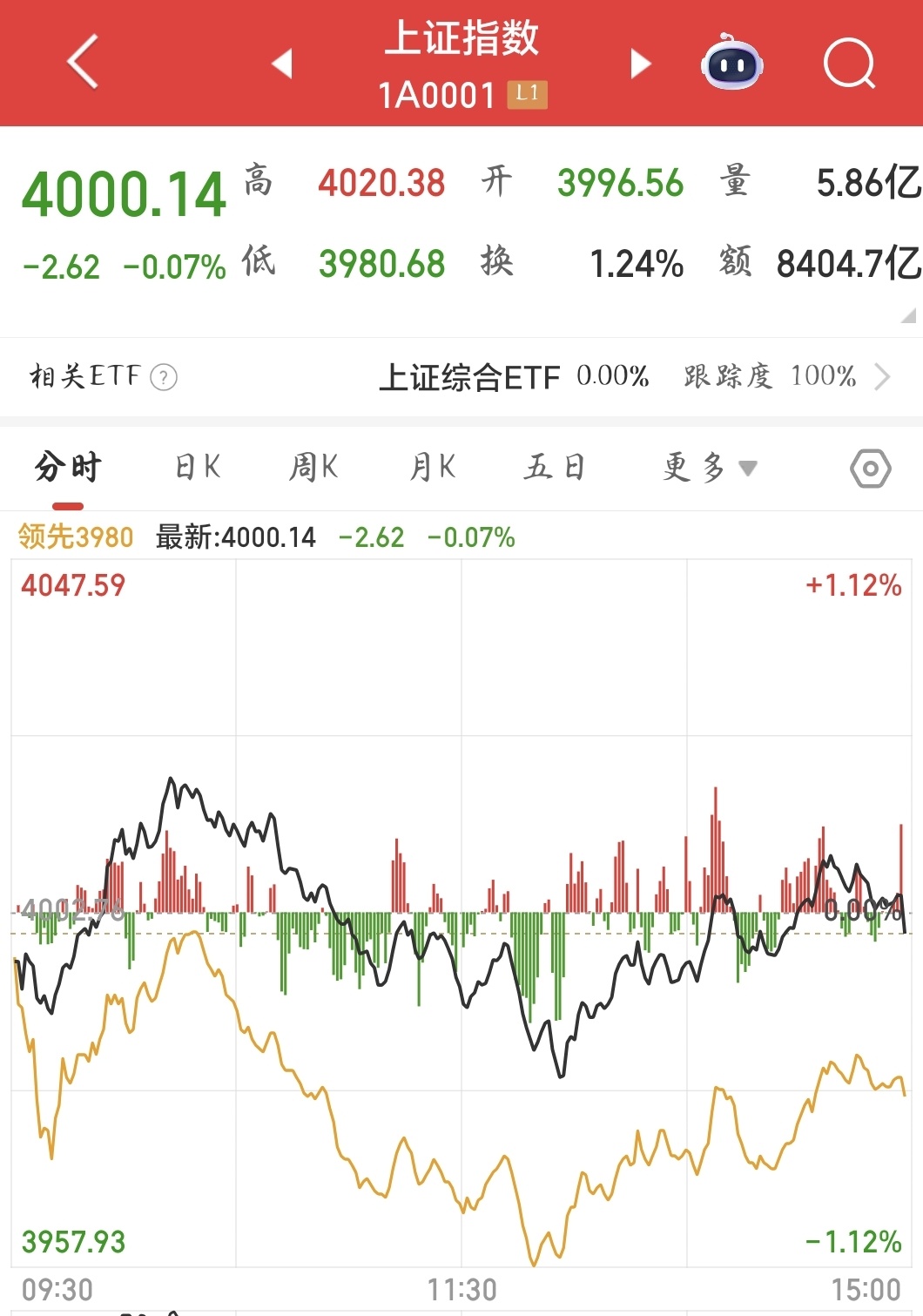 截至收盘,沪指微跌0.07%报4000.14点;深证成指跌0.36%收于13240.62点,创业板指跌0.39%报3122.03点。