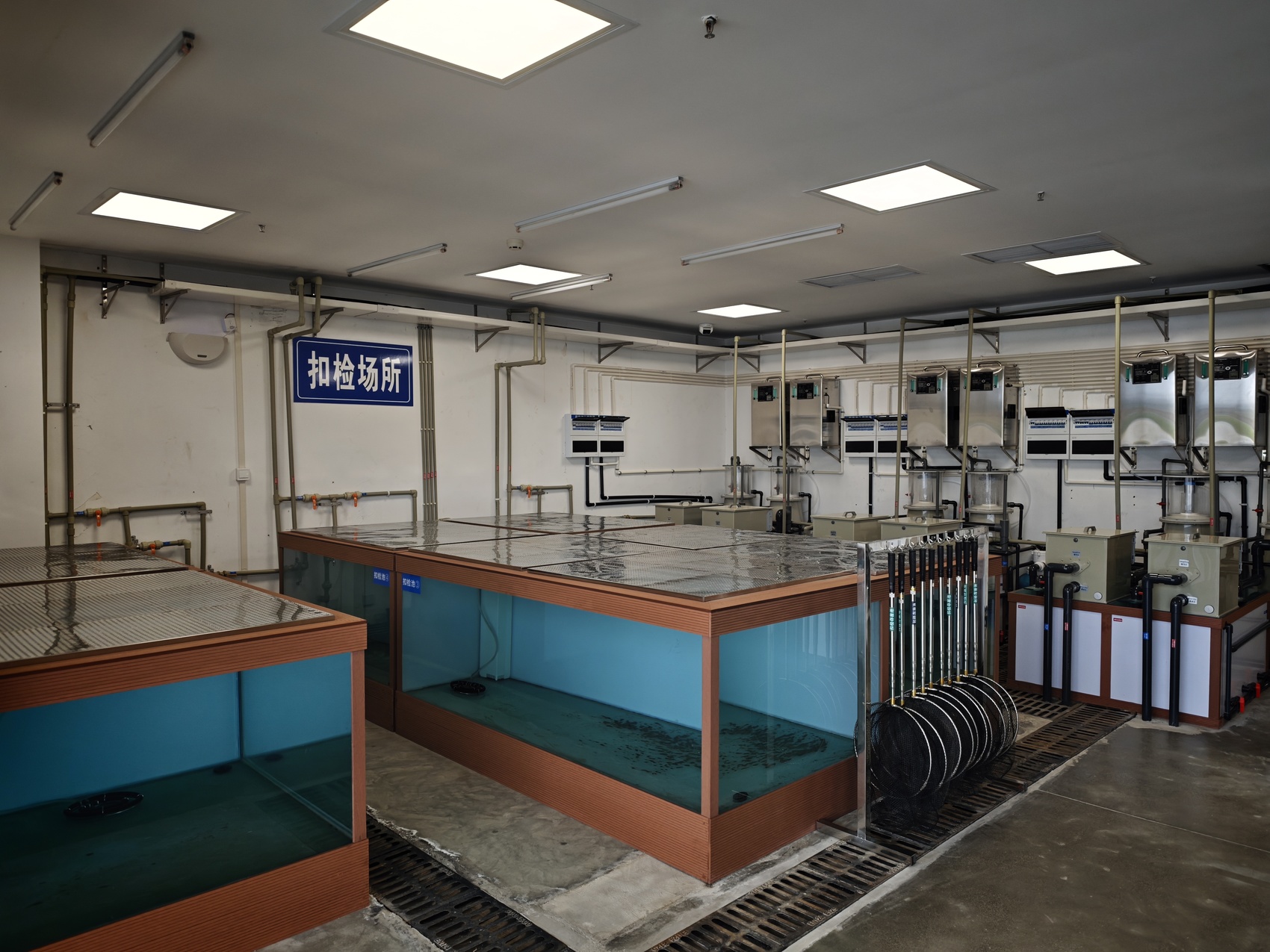 扣检池,是海关实施现场查验、隔离观察和确保生物安全的关键设施,主要用于进境水生动物的扣留检疫与暂养。据悉,此次改造对原有扣检池进行了扩容,并实现多重“智慧升级”——新增的全自动转鼓微滤机负责循环水过滤,可高效分离水中悬浮物、排泄物等杂质;精准温控系统能模拟各类水生生物的原始生活环境,无论是寒冷水域的帝王蟹还是热带地区的龙虾,都能有适宜的水温;臭氧发生器则可高效杀灭水中细菌病毒,降解有机物,保障水生动物的健康与安全。
