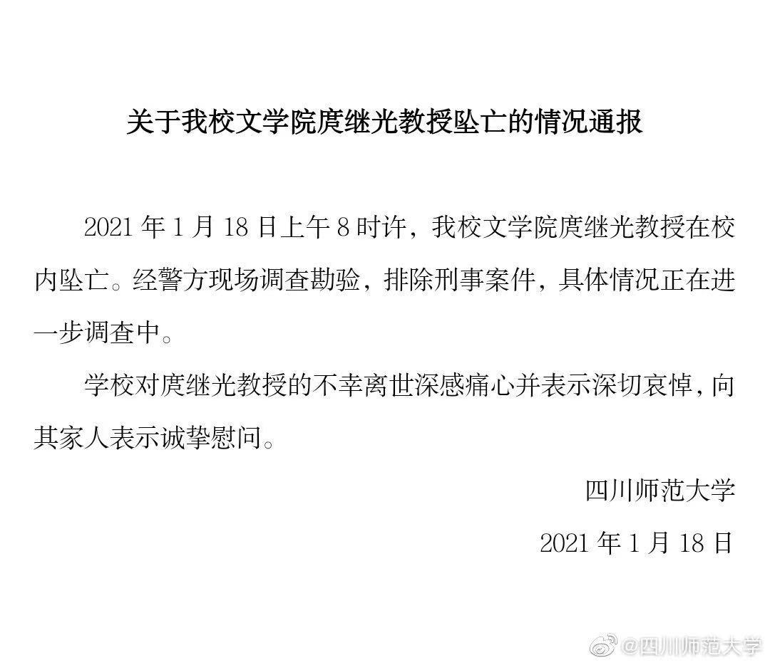 2021年1月18日上午8时许,我校文学院庹继光教授在校内坠亡。经警方现场调查勘验,排除刑事案件,具体情况正在进一步调查中。