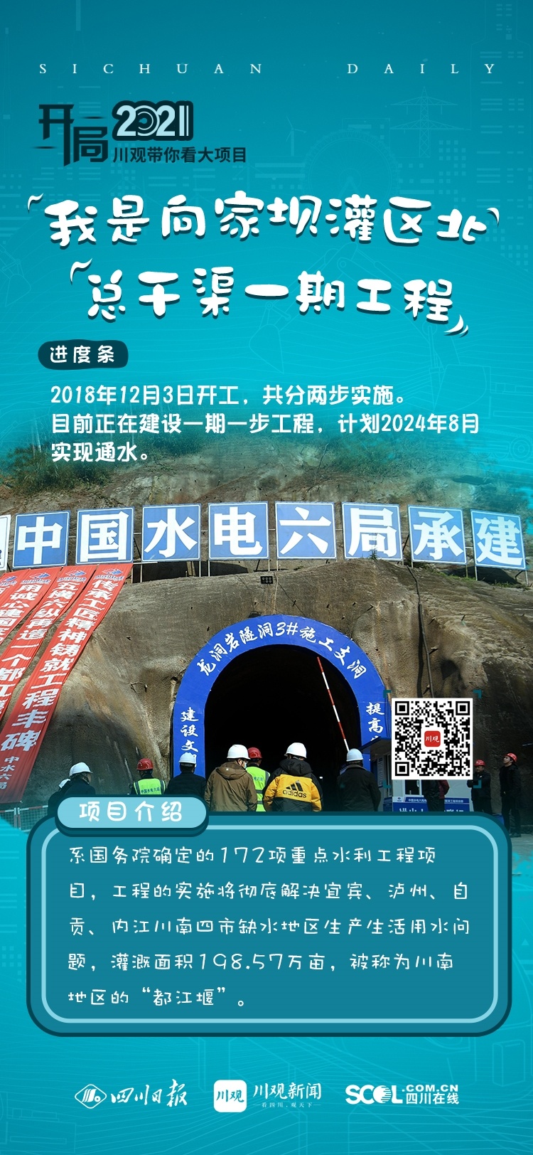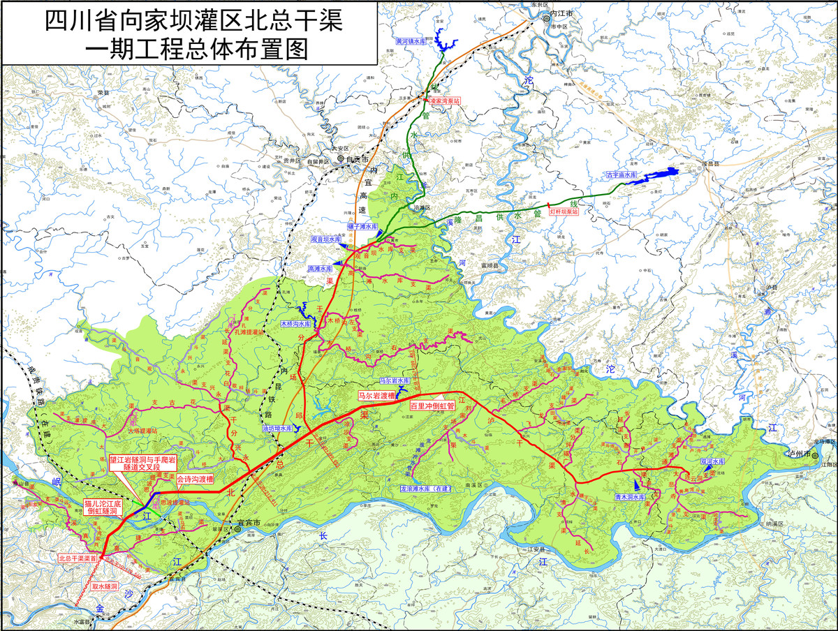 向家坝灌区北总干渠一期工程是国务院确定的172项重点水利工程项目,工程的实施将彻底解决宜宾、泸州、自贡、内江川南四市缺水地区生产生活用水问题,灌溉面积198.57万亩,被称为川南地区的“都江堰”。一期工程分两步实施,正在建设的是一期一步工程,于2018年12月3日开工,计划2024年8月实现通水。