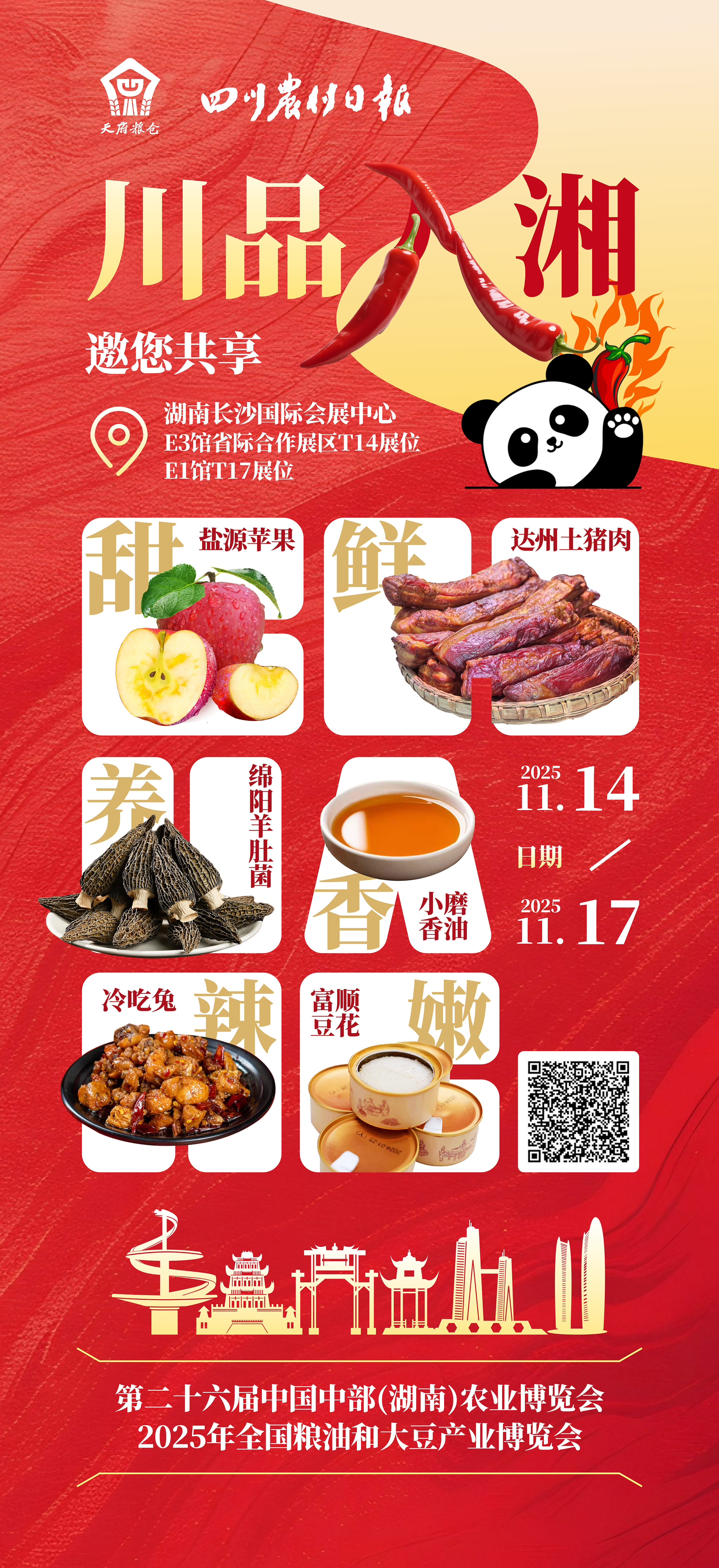 此外,四川展团还带来笋干、麻辣兔丁、核桃等多款特色农产品。活动同期举办2025年全国粮油和大豆产业博览会,包括富顺豆花等川味产品将亮相。据悉,本次四川农产品展厅在长沙国际会展中心E3馆省际合作展区T14展位及E1馆T17展位。