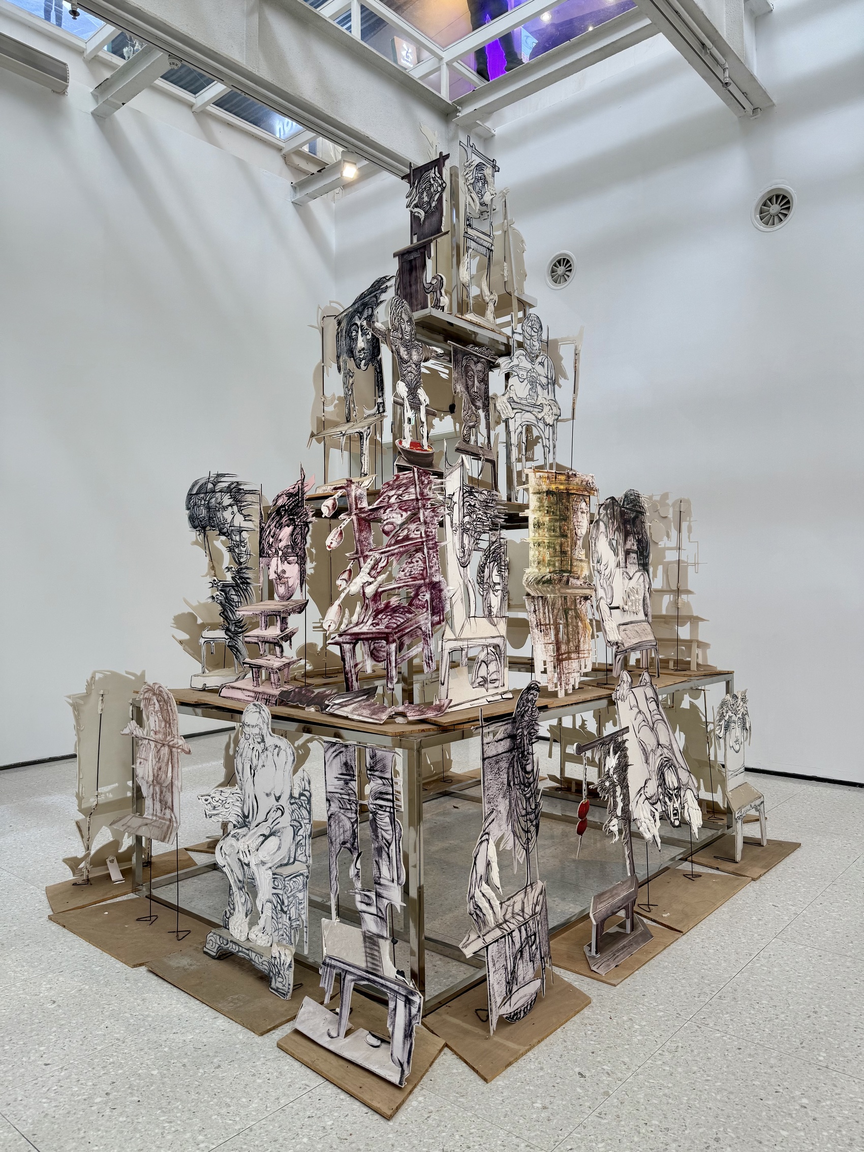 展厅的一角,一件底部3米见方、高5米的综合材料作品引人注目,由艺术家朱成创作的一系列椅子雕塑堆叠而成。这件《千席祭·虚位以待》,其原型石刻多见于宋代墓室,空椅代表未亡者的位置。