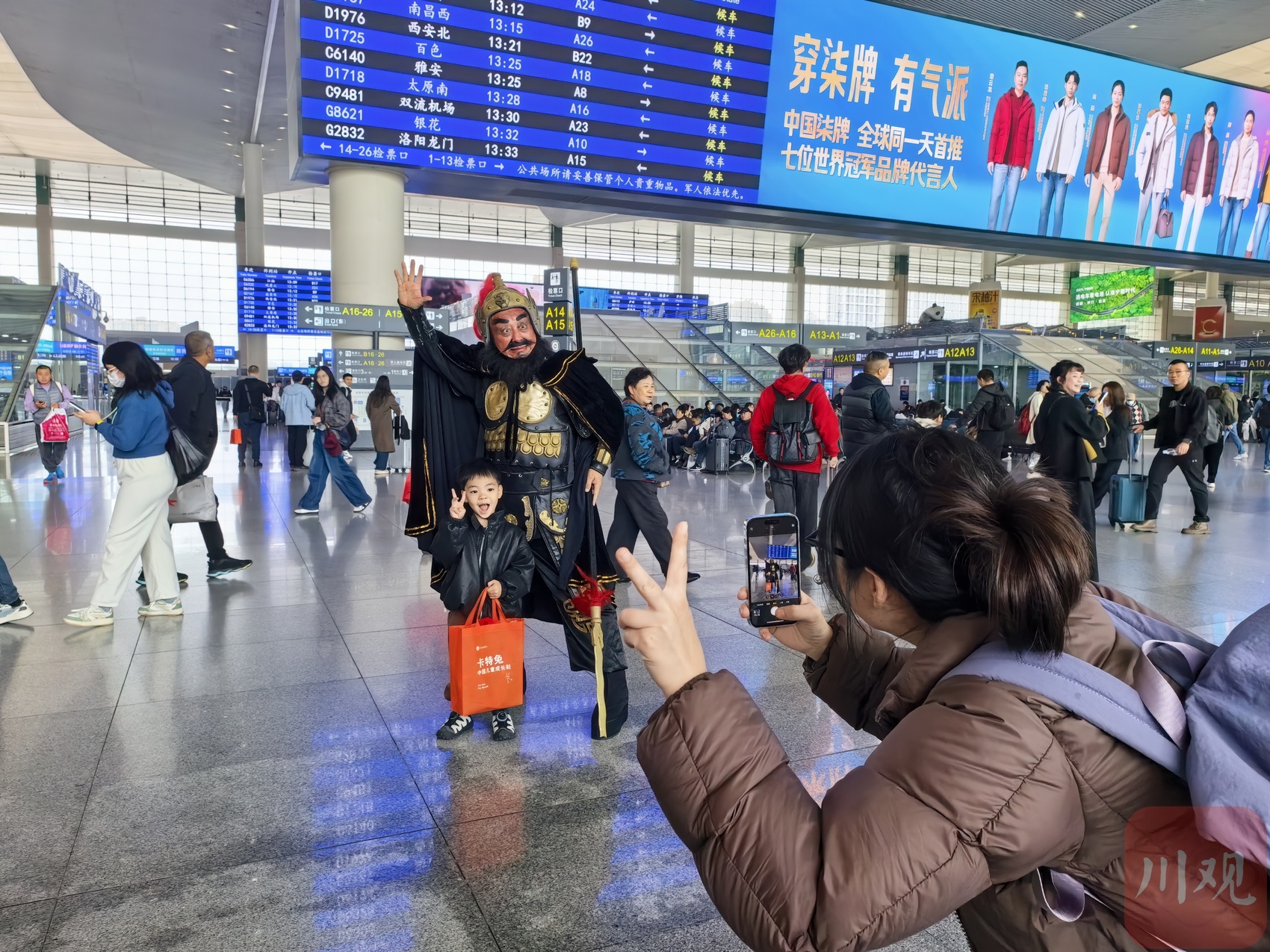 来自广元的“张飞”在成都东站展示广元的三国文化,吸引旅客合影留念。张敏 摄