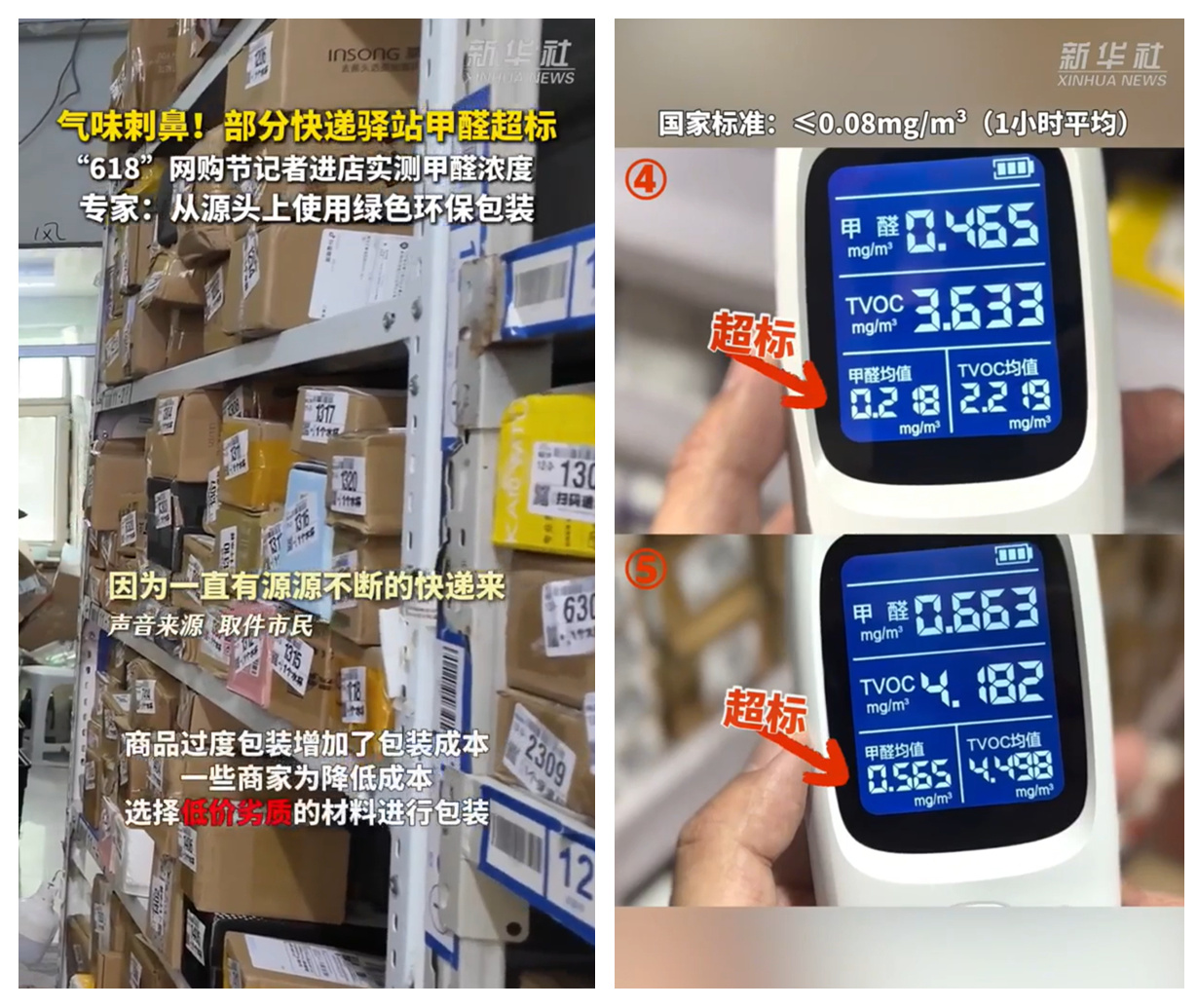 据媒体报道,此前有记者在一快递驿站用甲醛浓度检测仪进行测试。停留仅几分钟,检测仪上显示的甲醛浓度值就迅速超过国家标准,个别数值甚至是该标准的7倍之多。而“罪魁祸首”就是纸箱和包装。