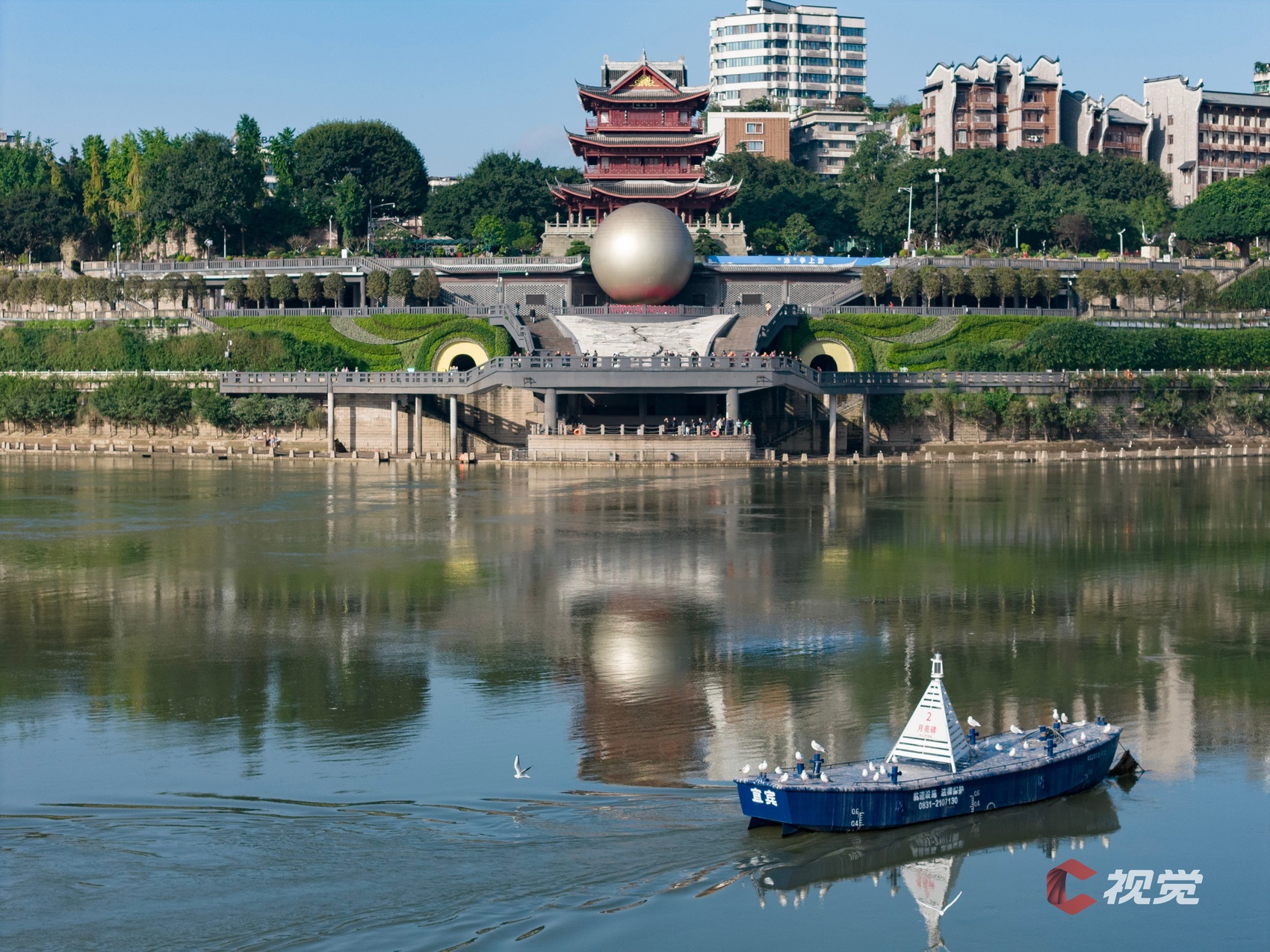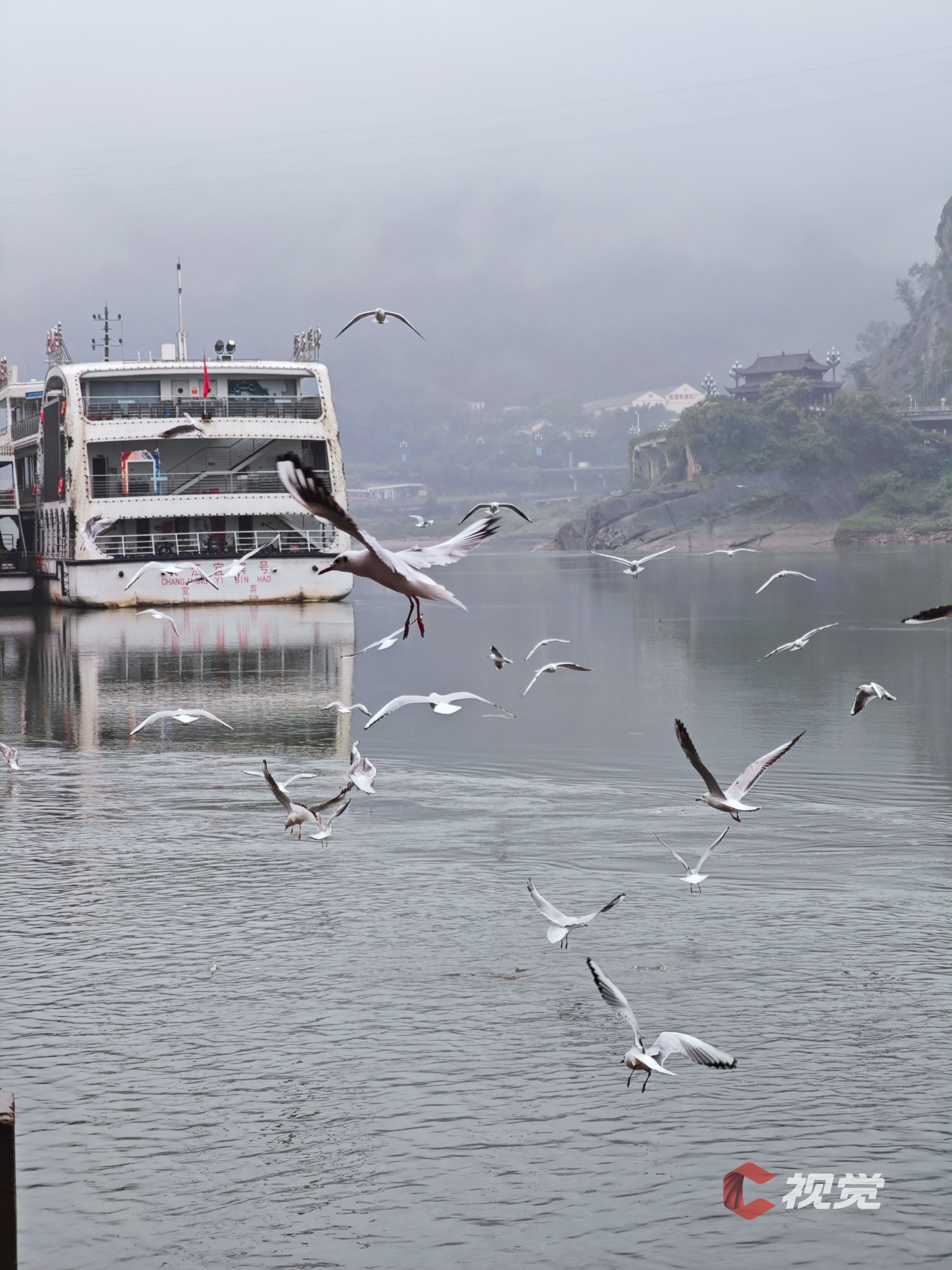 11月12日,在宜宾市翠屏区三江口长江江面上,一艘游船与翱翔的红嘴鸥同框。C视觉签约摄影师 赵宇
