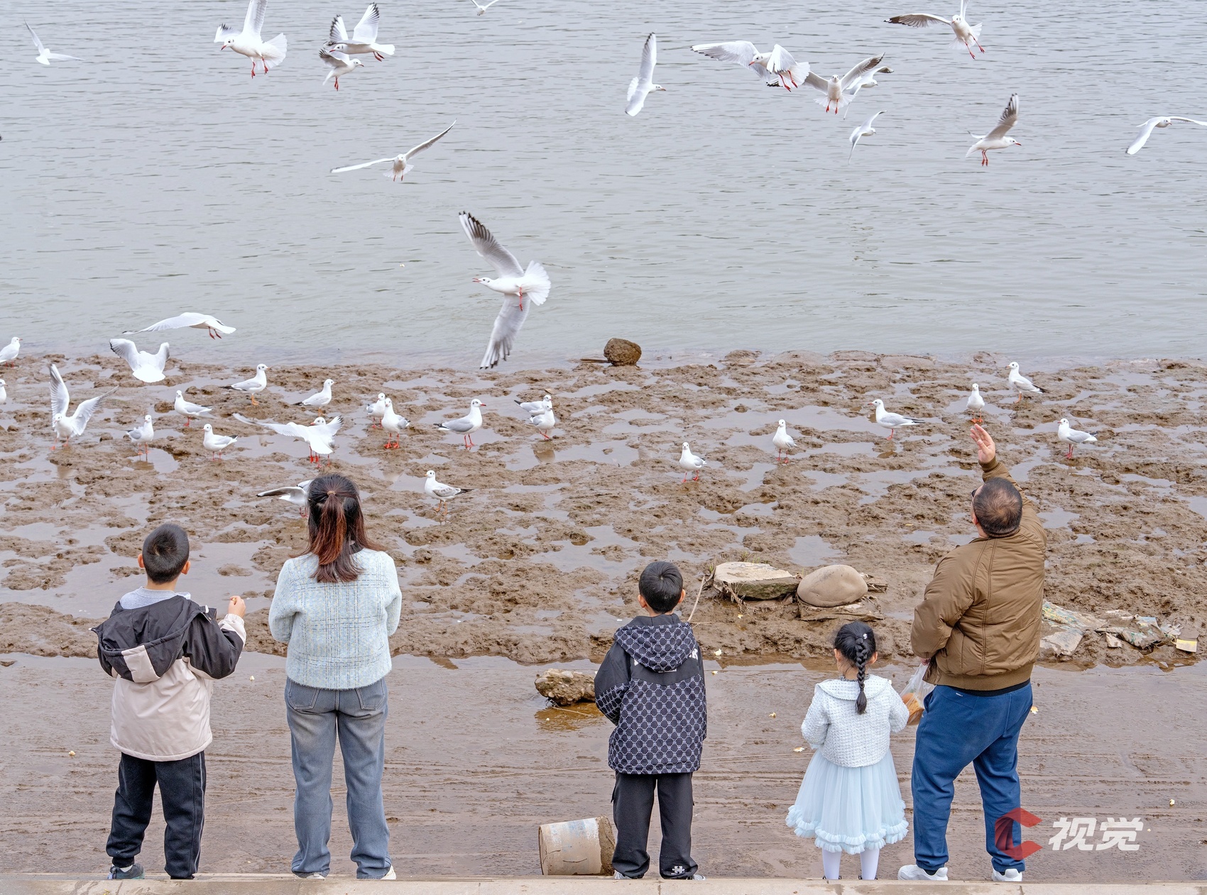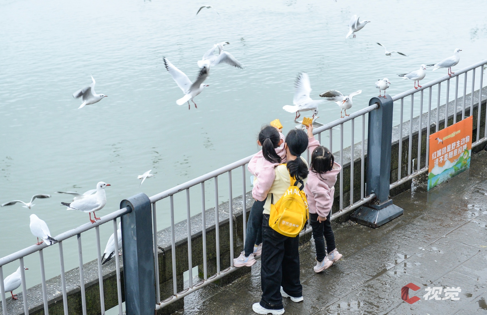 11月13日,在泸州江阳区东门口长江边,市民带着孩子喂食红嘴鸥。C视觉签约摄影师 张跃
