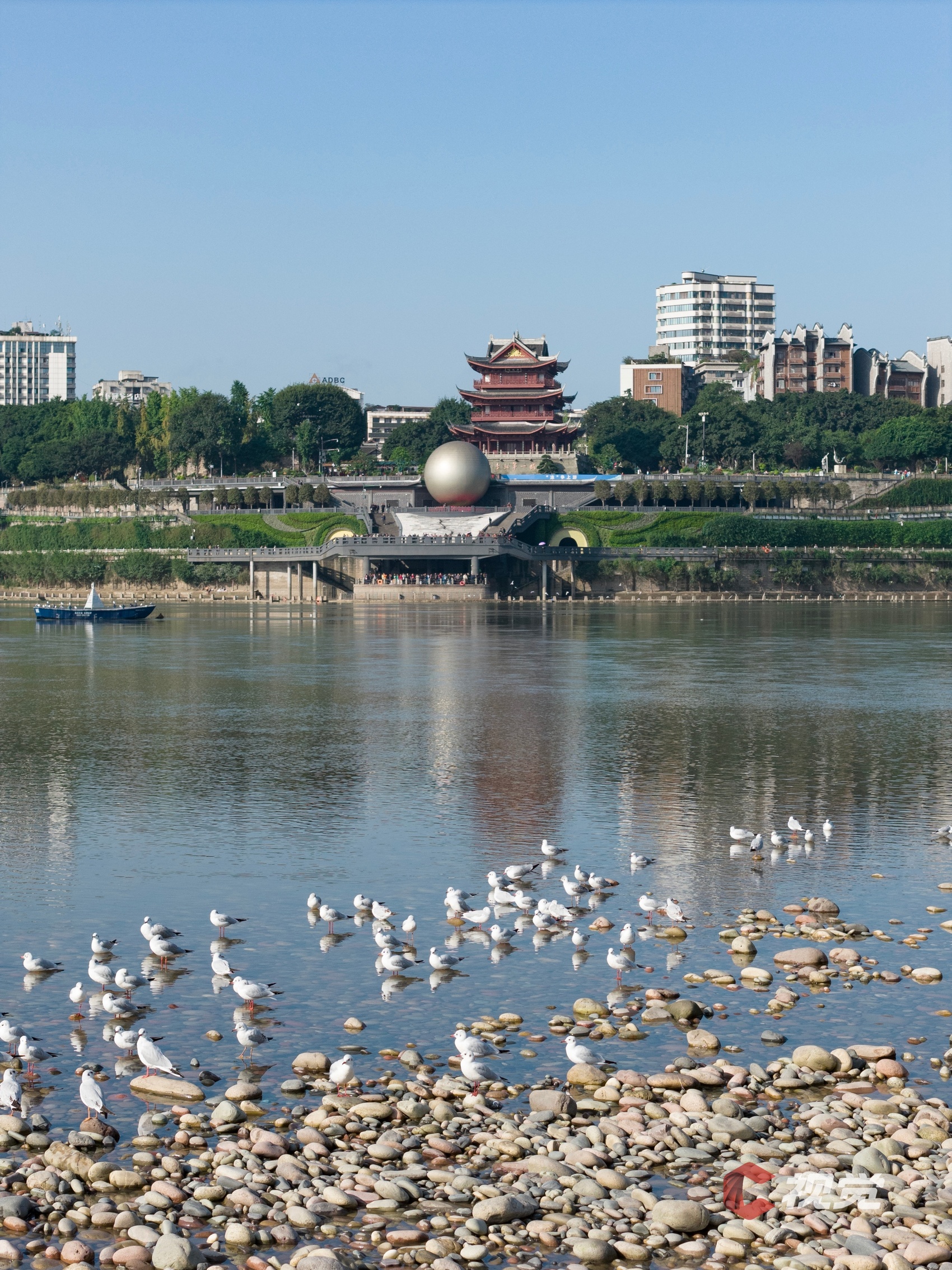 初冬时节,来自西伯利亚的红嘴鸥在宜宾市翠屏区合江门街道长江零公里地标旁的滩涂上小憩。C视觉签约摄影师 彭珉翔