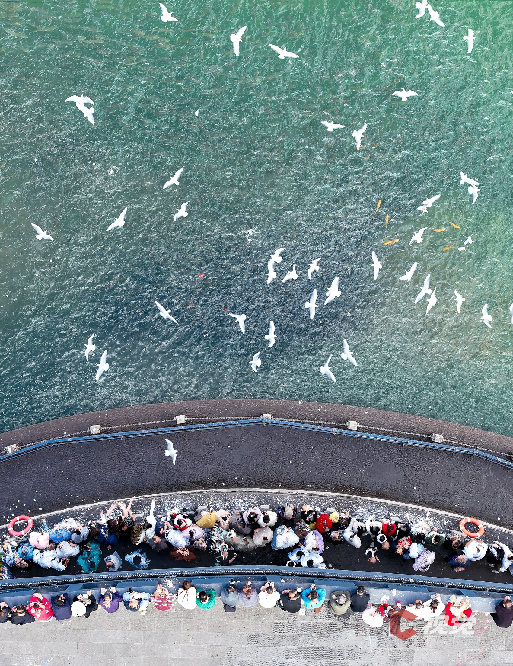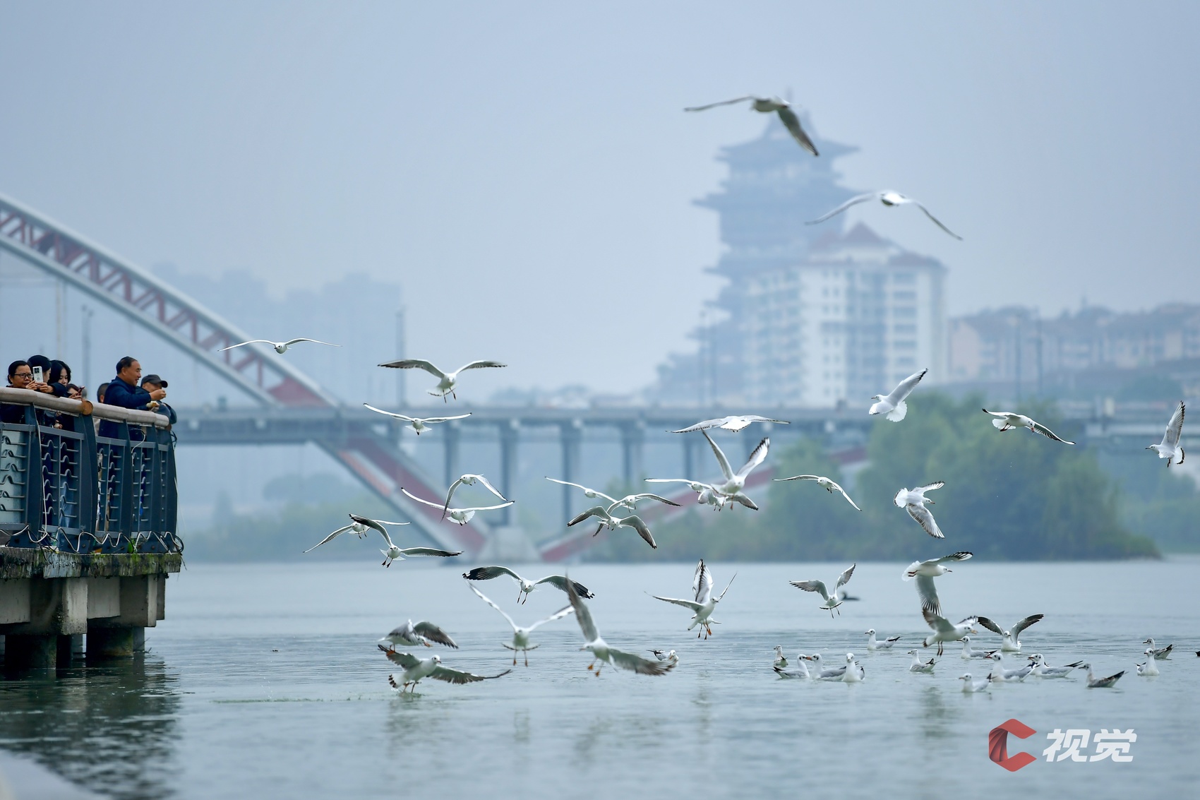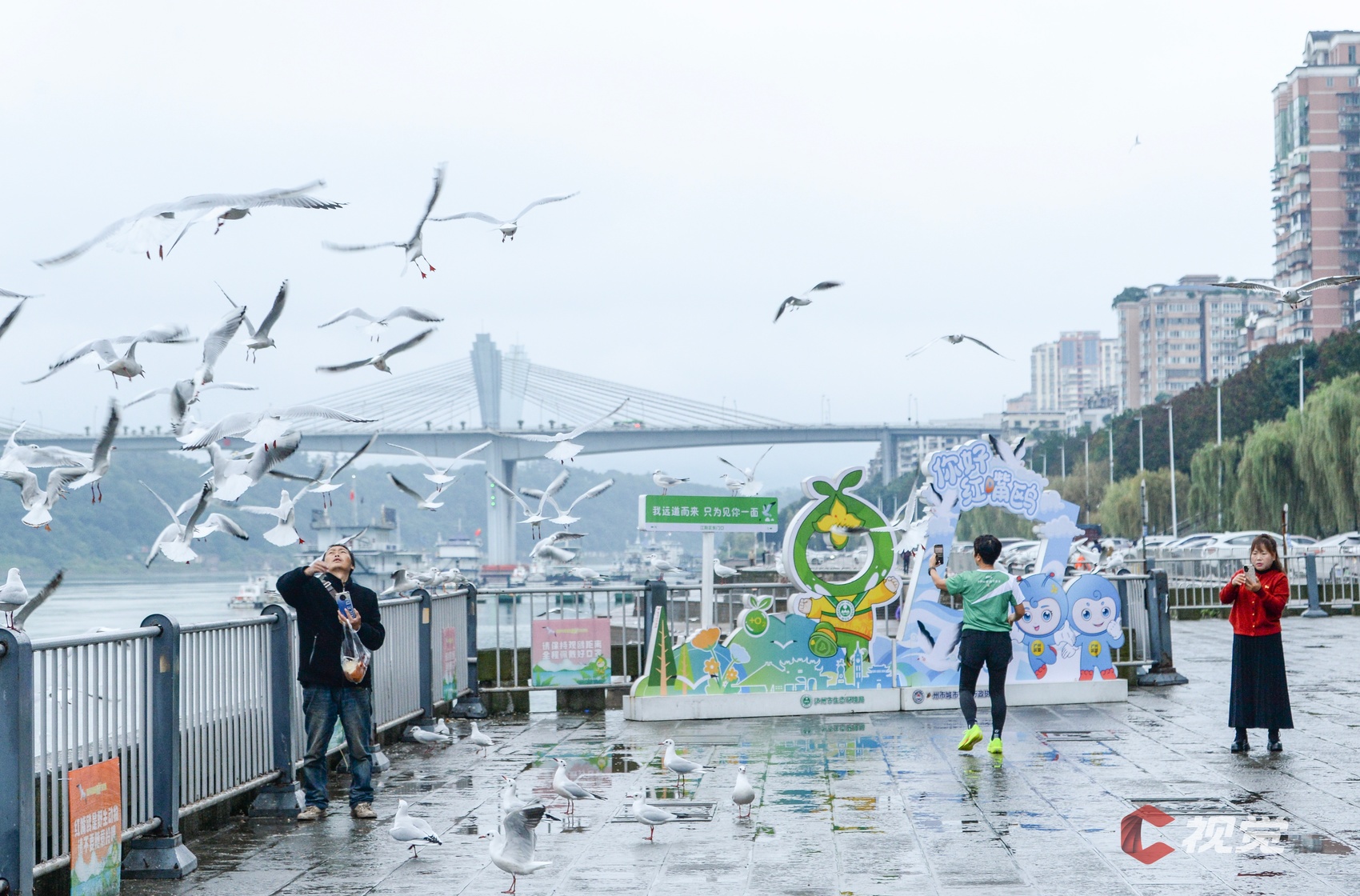 初冬时节,市民和游客在宜宾市翠屏区合江门长江地标广场,欣赏如约重返的“鸥翔鱼跃”美景。C视觉签约摄影师 张元戎