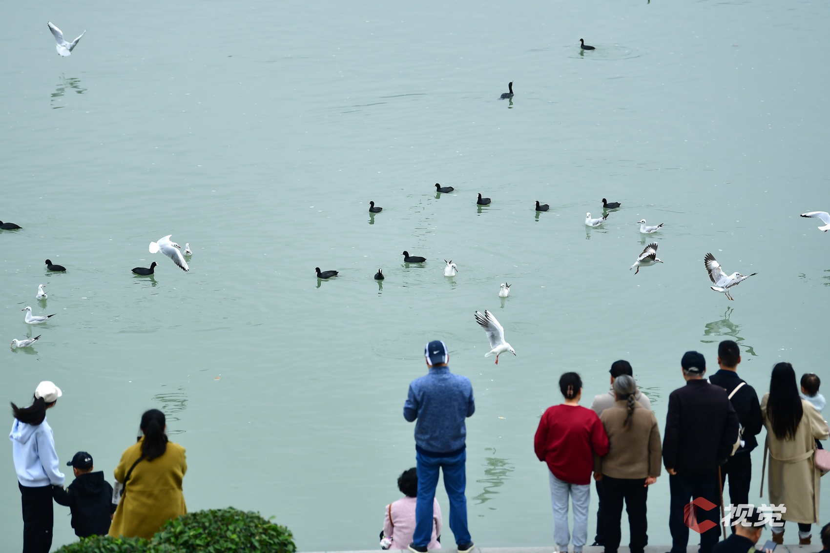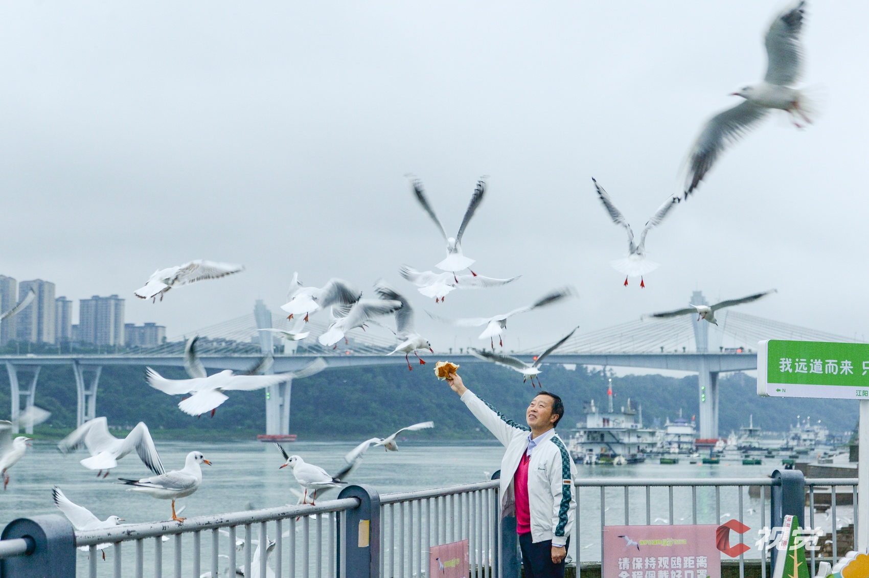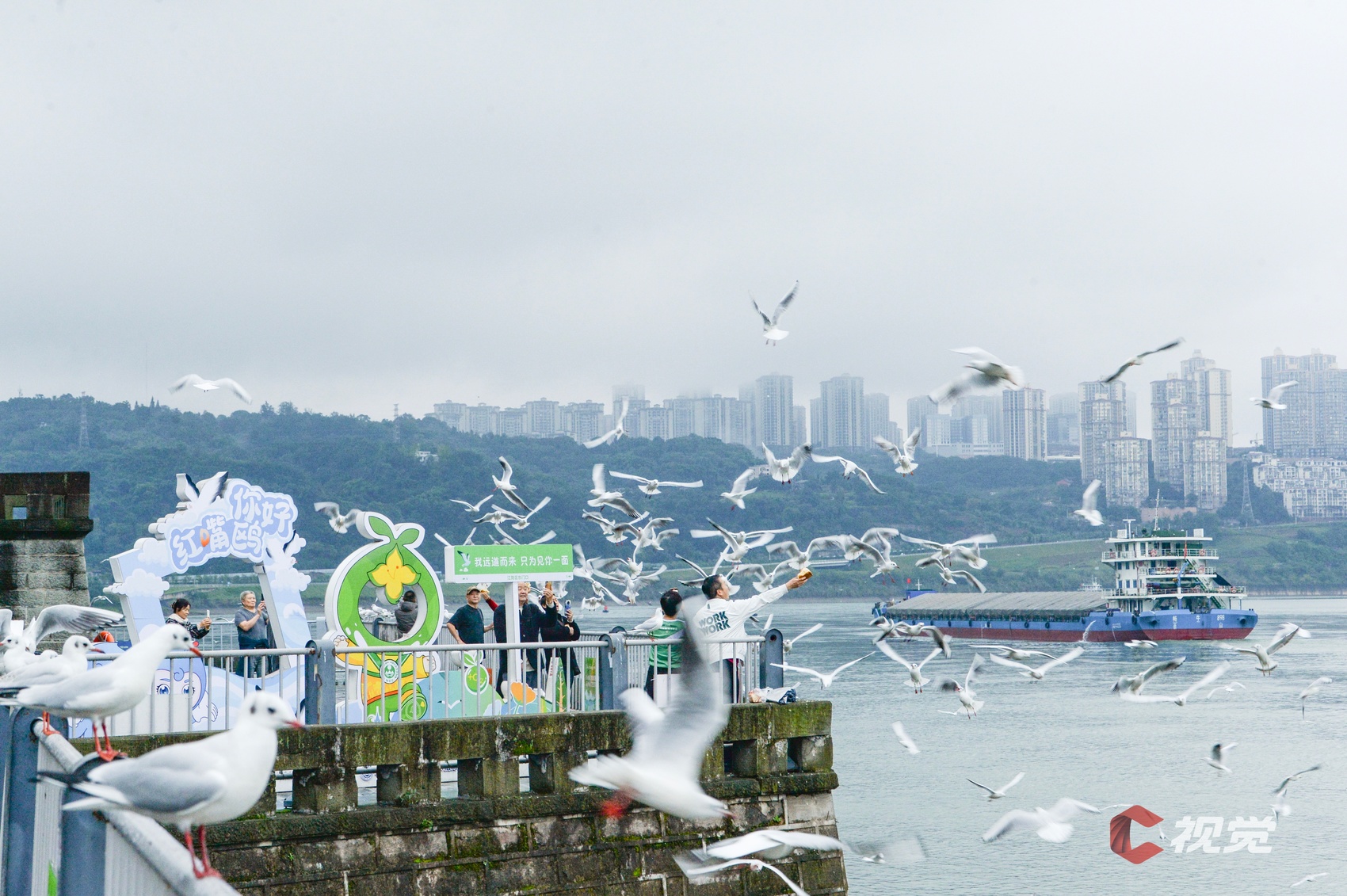 11月13日清晨,泸州江阳区东门口长江边,市民正在与红嘴鸥互动。C视觉签约摄影师 张跃