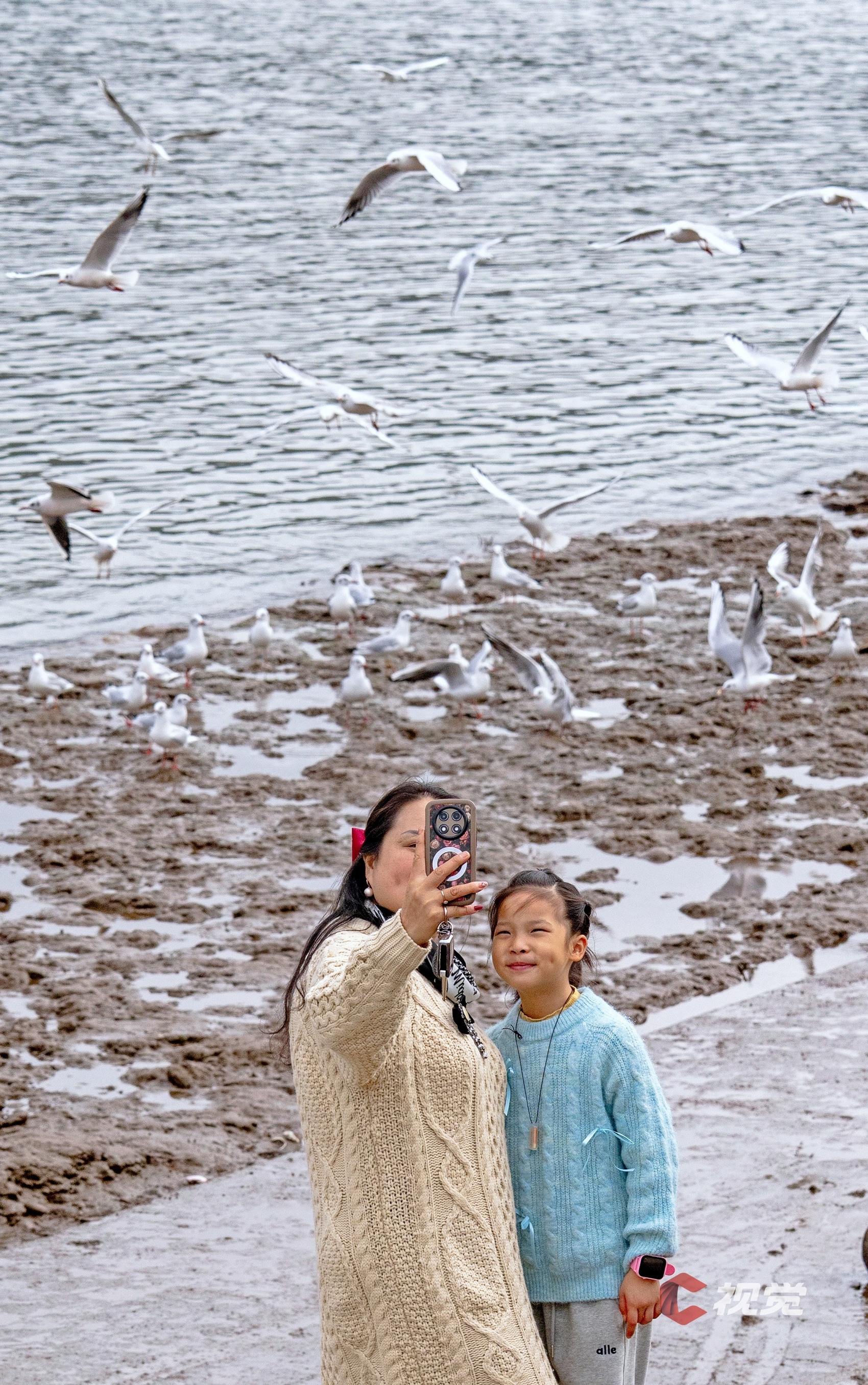 11月13日,秋假期间,宜宾市江安县不少家长带领小朋友到长江边零距离观察投喂红嘴鸥。C视觉签约摄影师 蔡磊