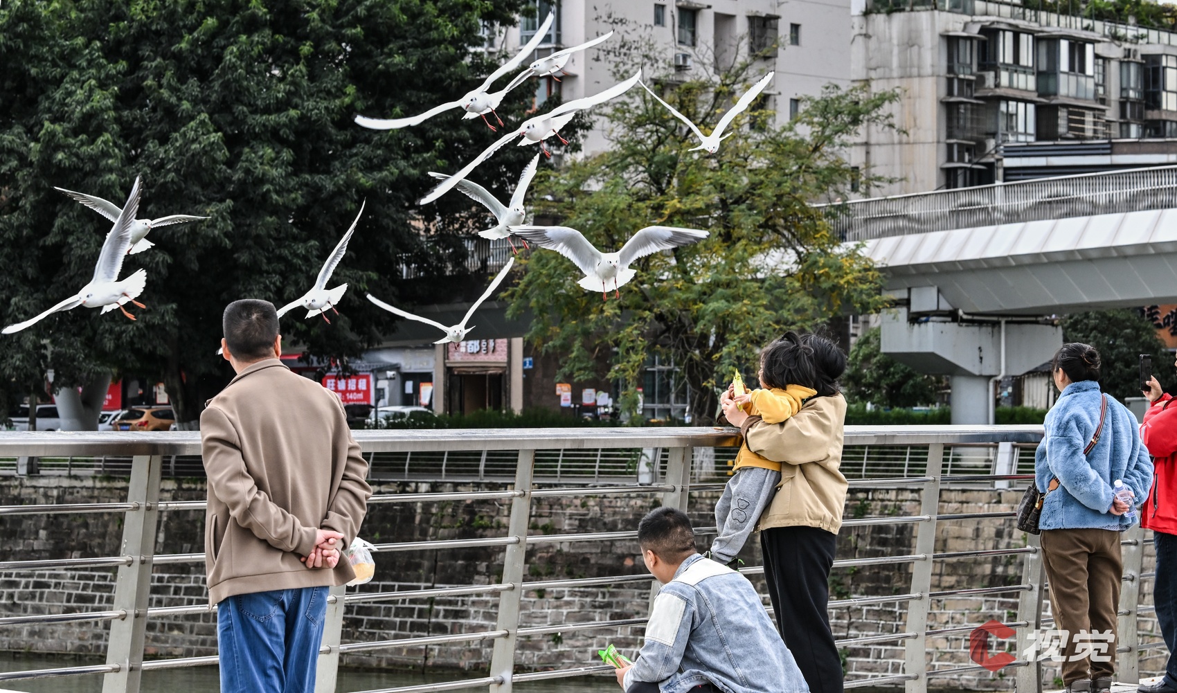 11月7日立冬,德阳市民正在岷江桥抛食喂养红嘴鸥。C视觉签约摄影师 王福明