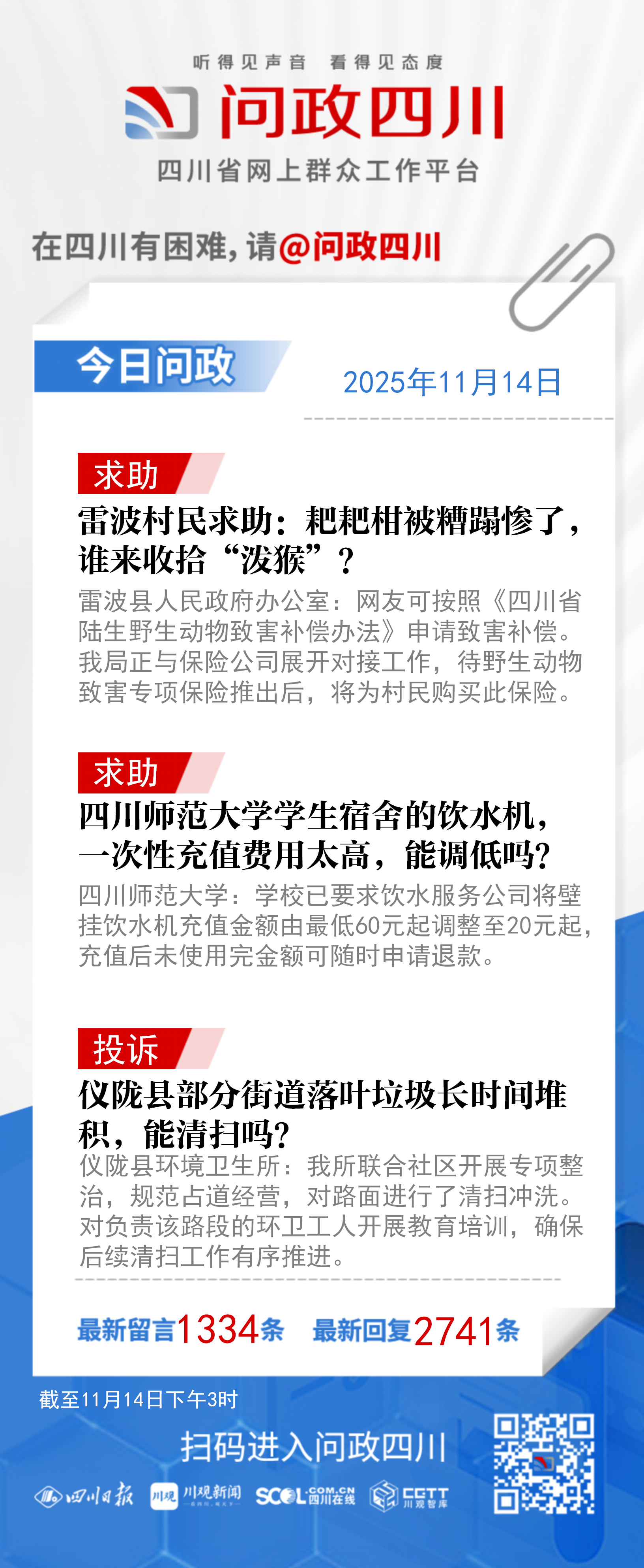 在四川有困难,找问政四川。如果您在四川遇到了操心事、烦心事、揪心事,请登录“四川省网上群众工作平台—问政四川”或拨打问政四川热线(028-96001)留言反映、求助或建议。我们将充分发挥平台的互动联系作用及舆论监督功能,第一时间传递民声,推动问题得以及时解决——听得见声音,看得见态度。