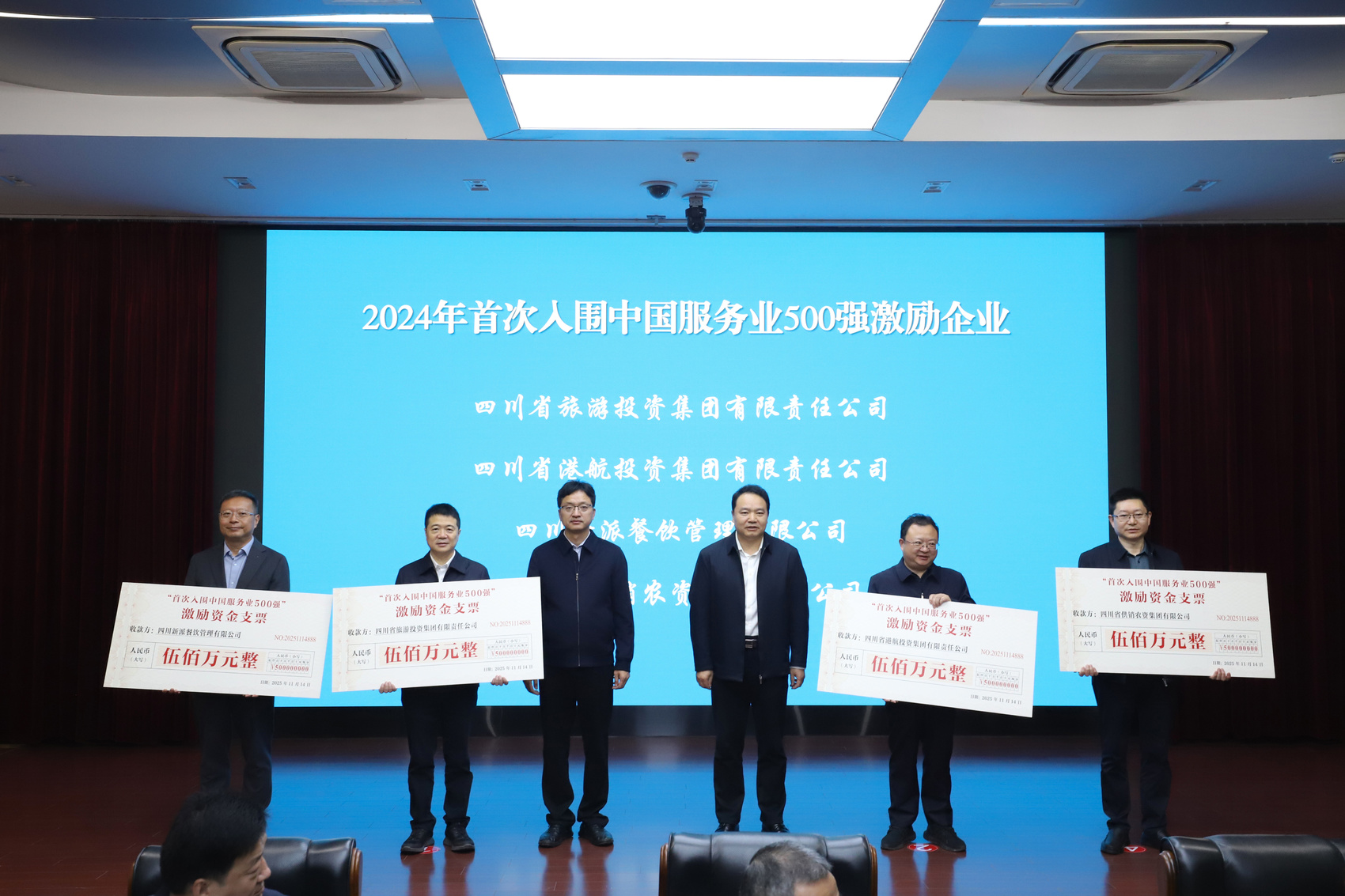 专门为服务业企业颁发财政资金奖励而开一场会,这在四川还是首次。现场,获得奖励的企业被分成了两队:一队,是2024年首次入围中国服务业500强的4家企业,今年他们又再次蝉联中国服务业500强,每家企业获得500万元财政资金激励。另一队,则是“升级入库”“再上台阶”等达到不同成长规模目标的45家企业,每家企业分别获得30万元—500万元激励。