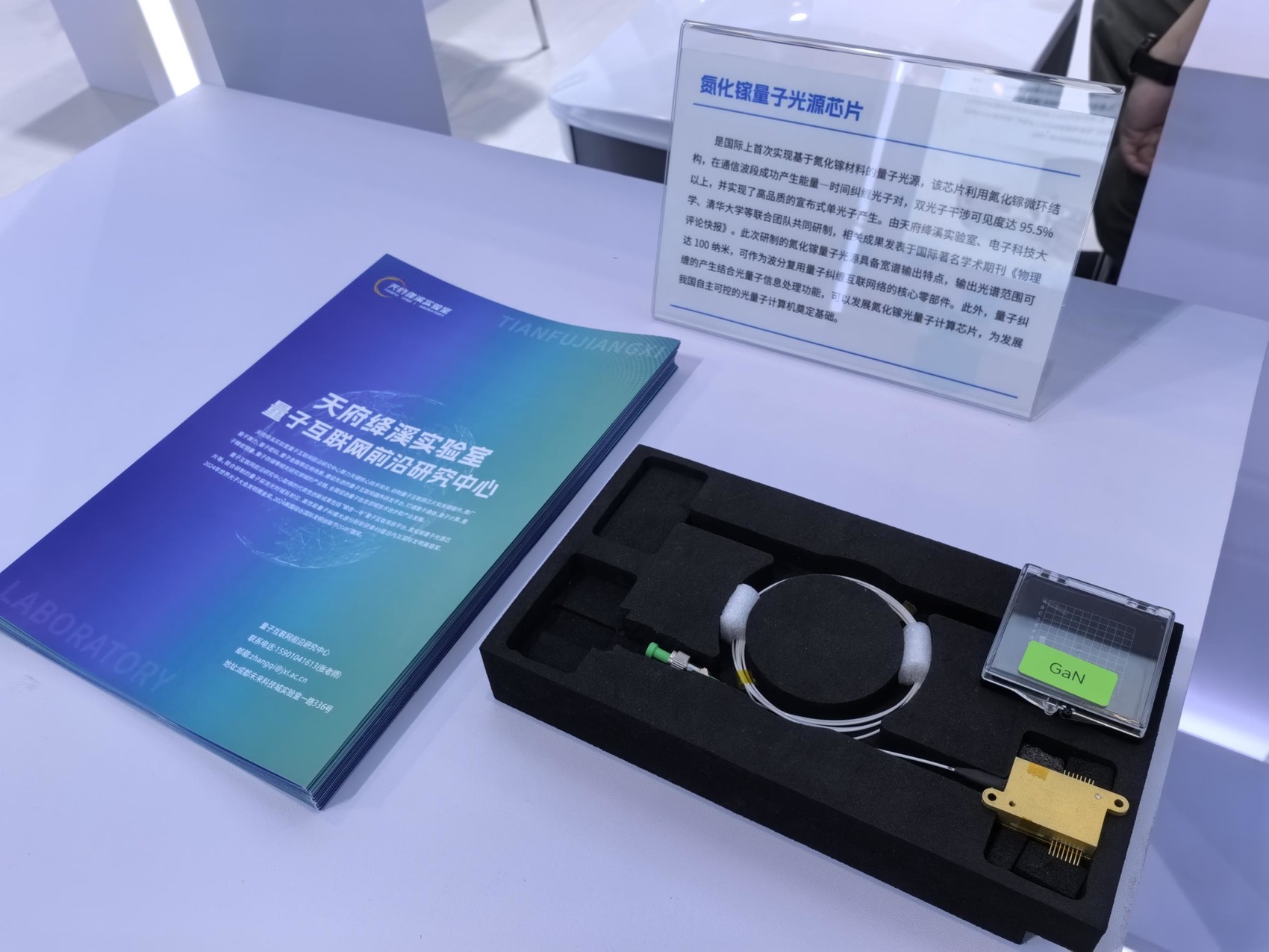 在天府绛溪实验室量子互联网前沿研究中心孵化企业天府芯穹科技(成都)有限公司展台,一款芯片吸引了与会者的注意,它就是氮化镓量子光源芯片,是国际上首次实现基于氮化镓材料的量子光源。