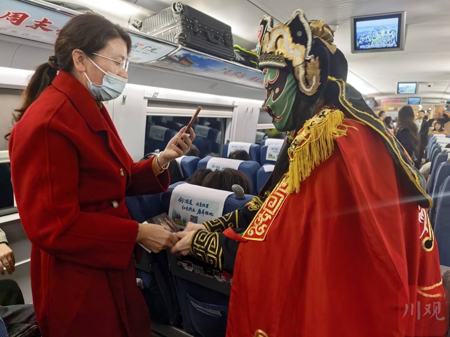 快闪活动上,川剧演员表演变脸与旅客互动。