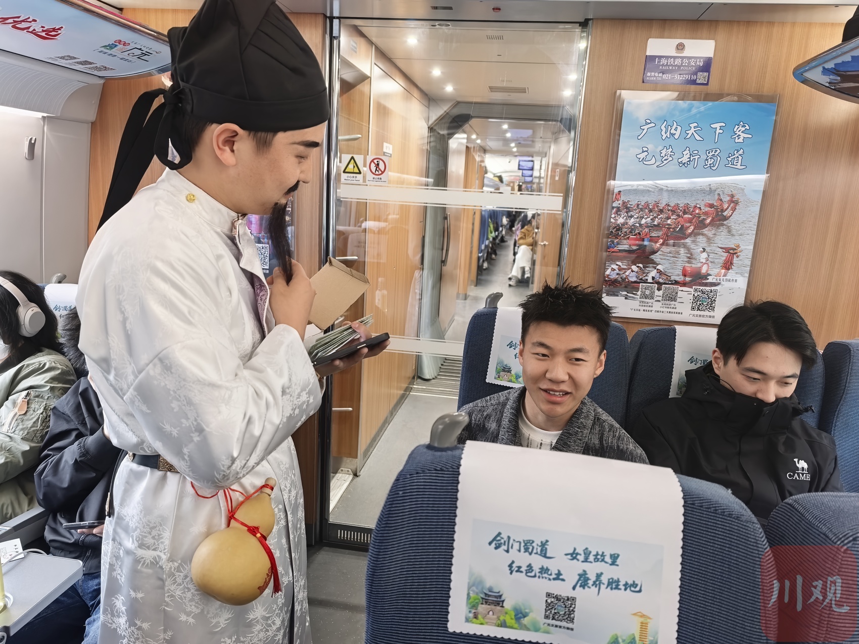 “地崩山摧壮士死,下一句是什么?”“然后天梯石栈相勾连。”高铁列车车厢内互动热烈,由广元当地演员扮演的“李白”手持摇扇,一边提问一边给答对的旅客赠送广元文创产品及景区门票。