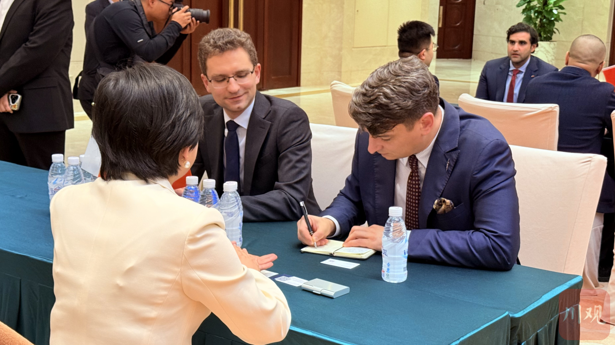 此前一天的产业考察中,四川新质生产力成果已引发考察团热议。在成都沃飞长空展厅,国内首款大型载客电动垂直起降飞行器前人头攒动。“它目前电池容量是多少?”“面向欧洲买家的定价是多少?”斯洛文尼亚、罗马尼亚等国代表接连发问,部分代表钻进驾驶舱试乘,在模拟驾驶器上体验“空中爬升”。