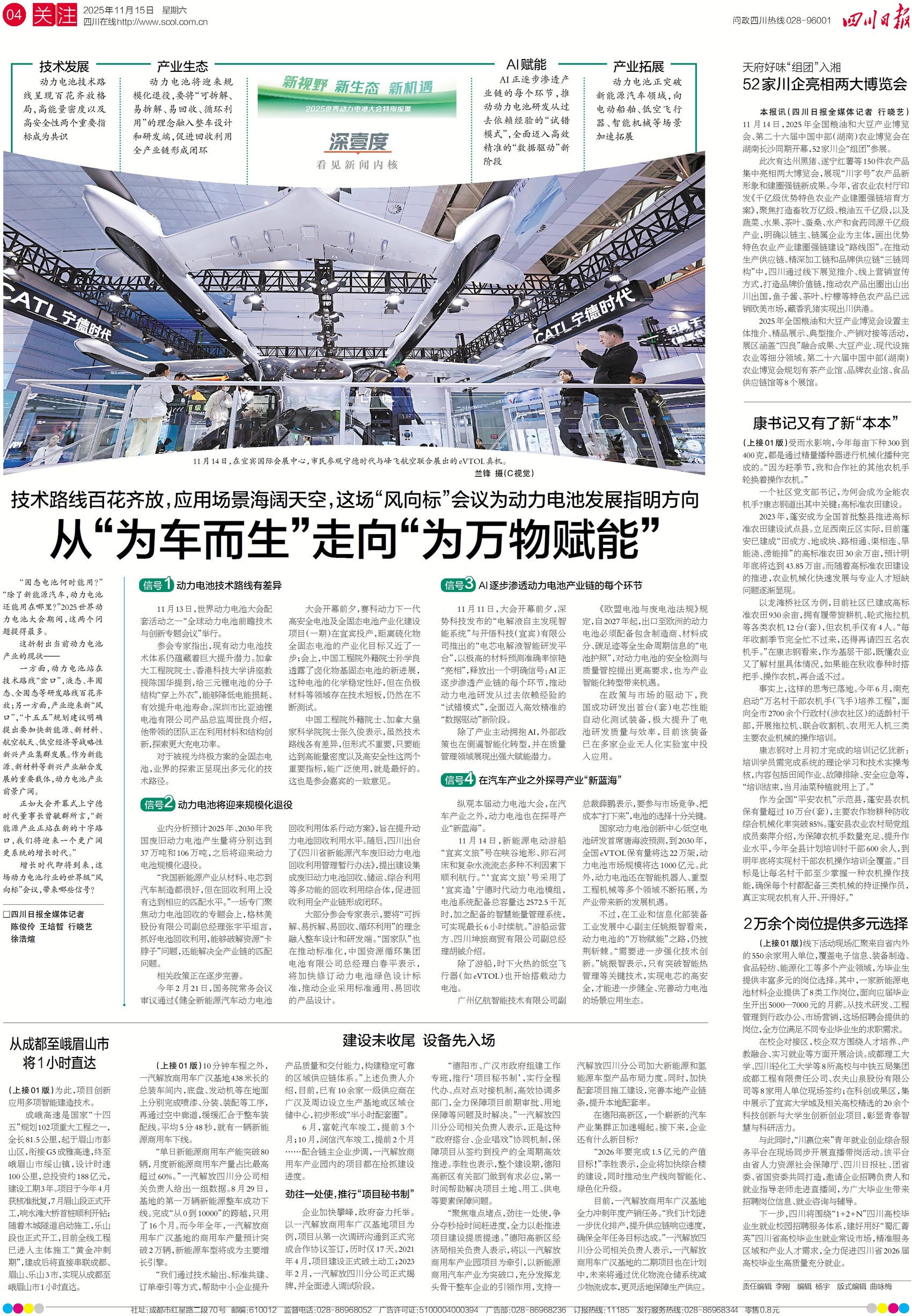 动力电池是否只能用在新能源车上?这个很多人关注的问题,2025世界动力电池大会给出了答案:从电动游船到低空飞行器,甚至智能机器人和重型机械都在拥抱动力电池这个能量心脏。近年来,我国动力电池产业快速发展,AI技术已深入动力电池产业链各环节,研发正转向数据驱动,动力电池将更加智能高效。关注今日四版,看这次世界动力电池大会还传递了哪些信号。