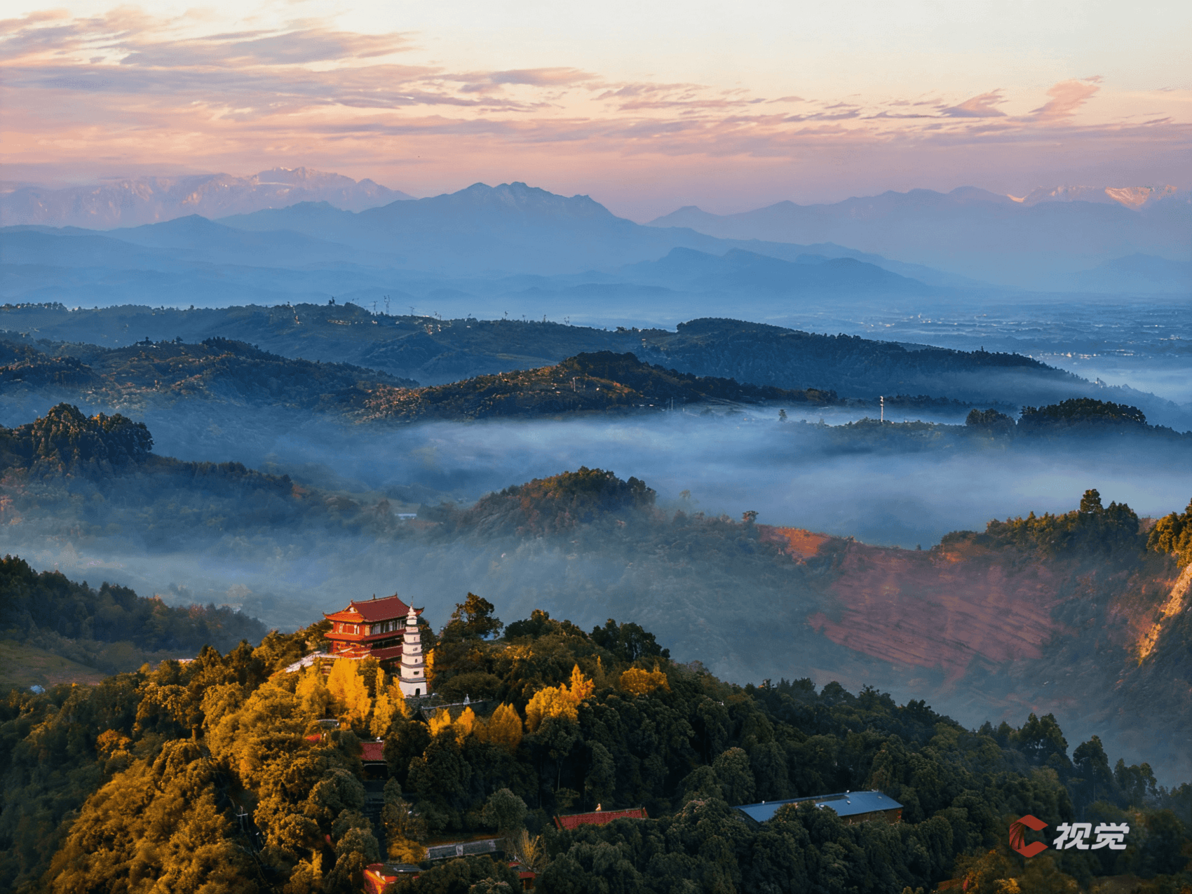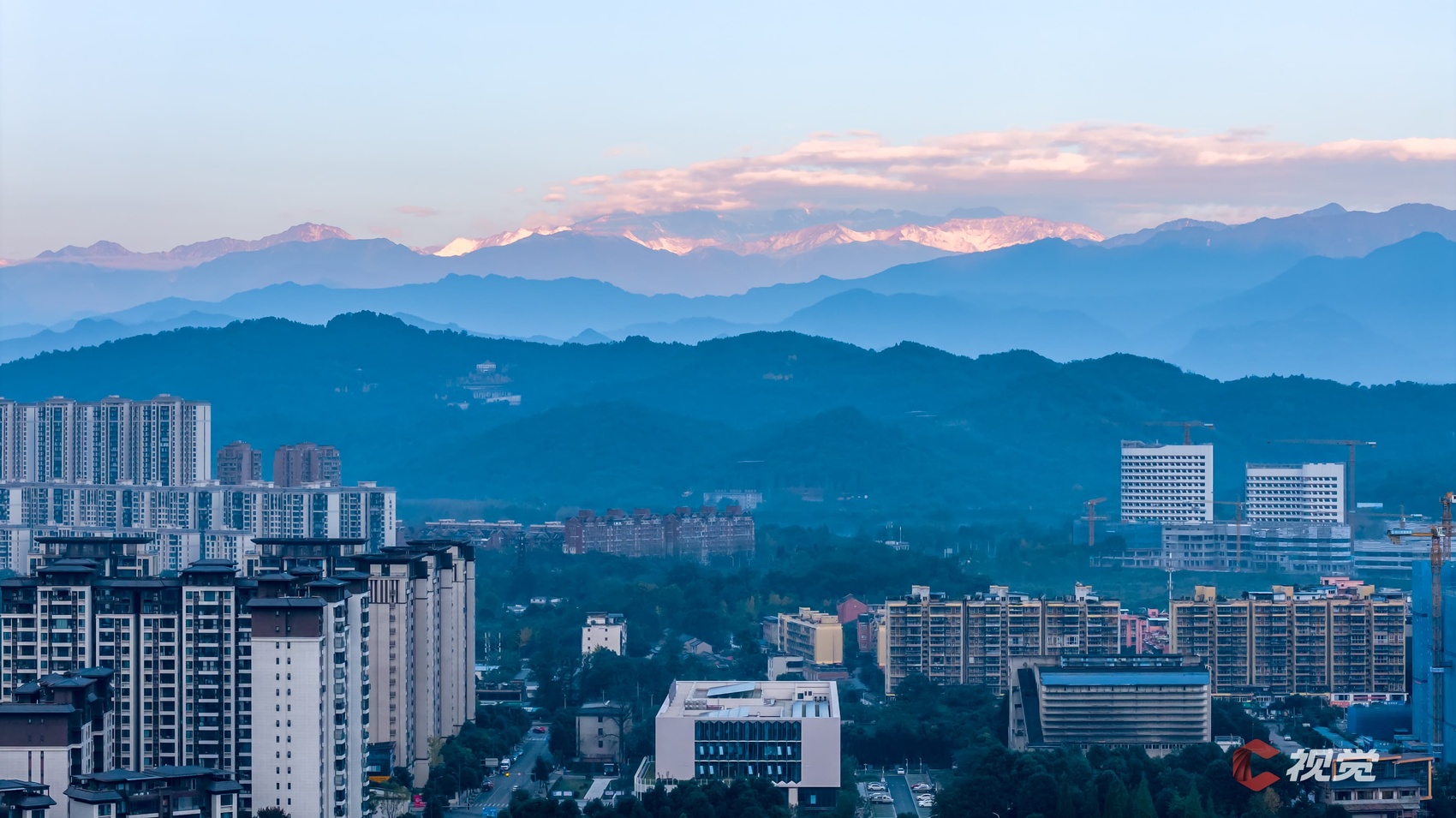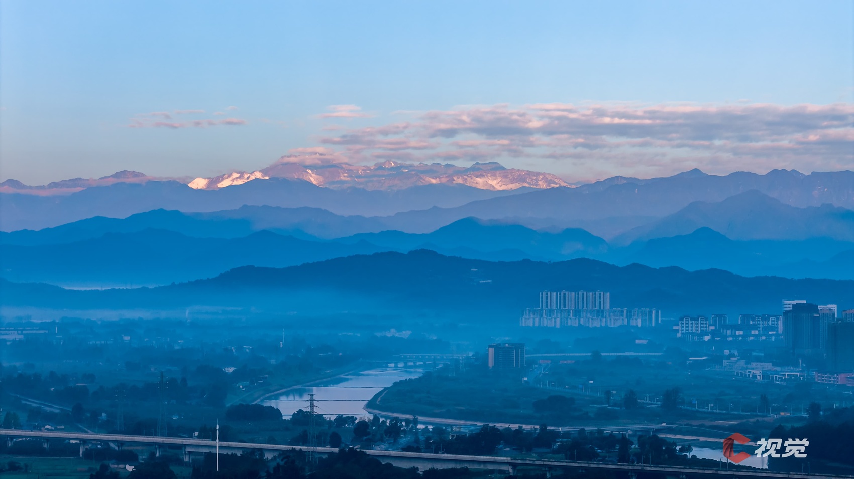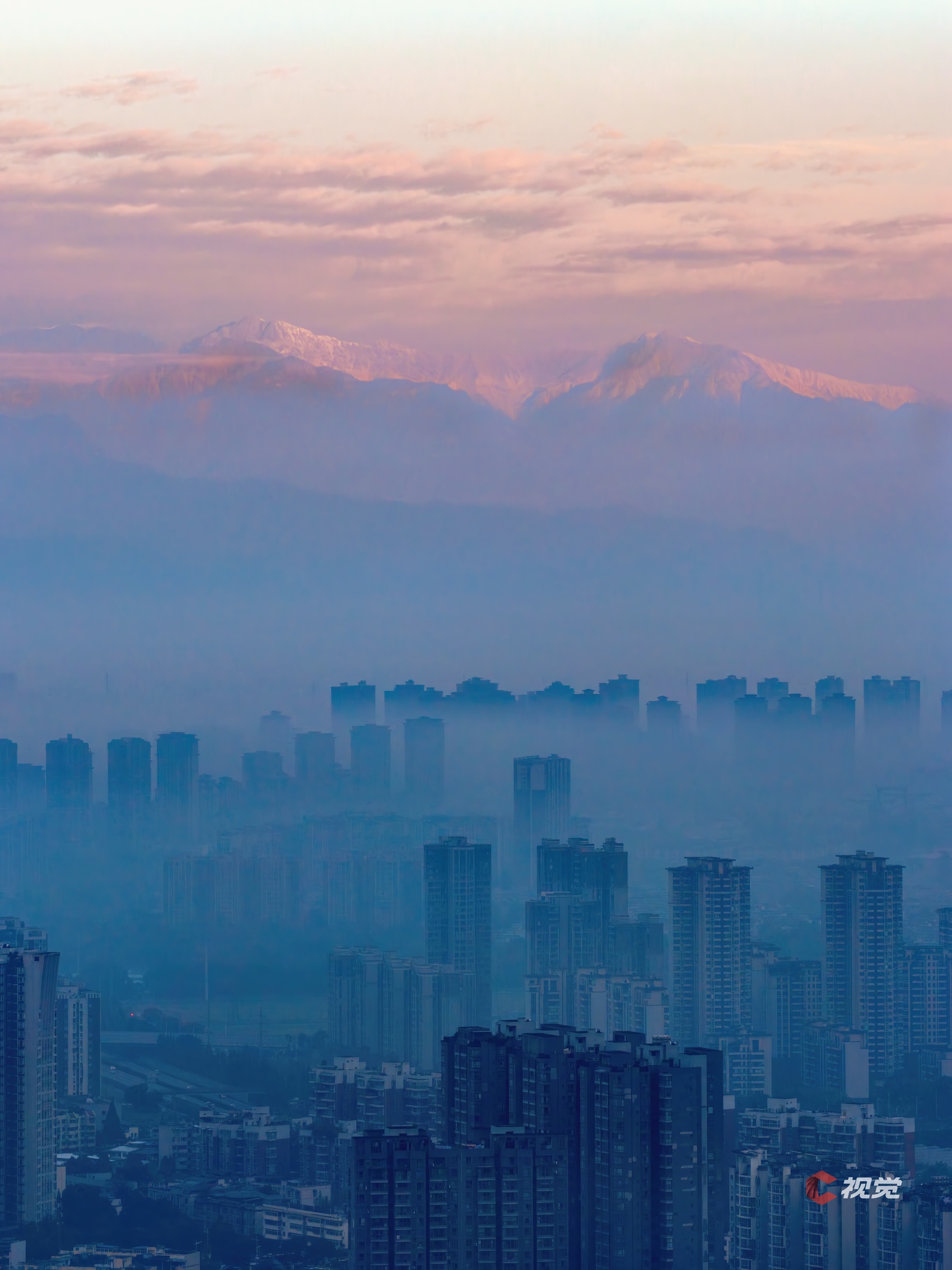 11月15日晨,在成都温江城区,朝霞把云端雪峰染成粉色,渲染出暖色的冬日清晨。C视觉签约摄影师 雷云