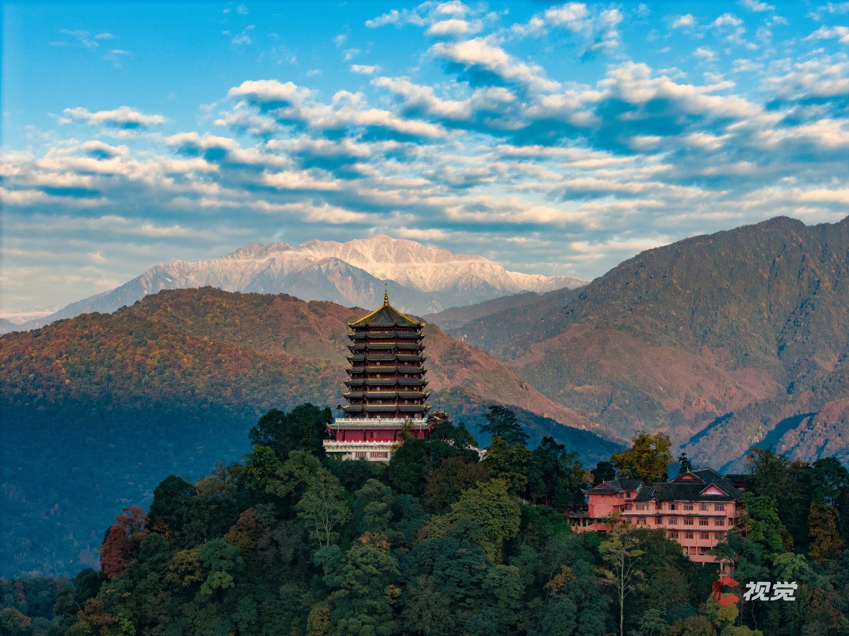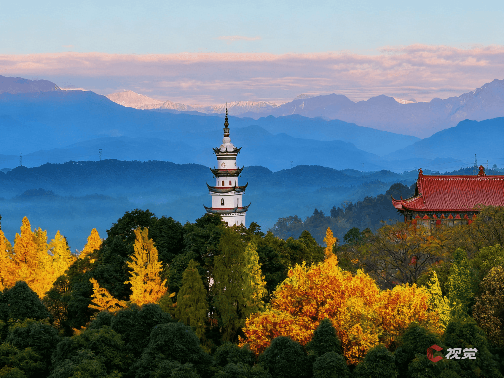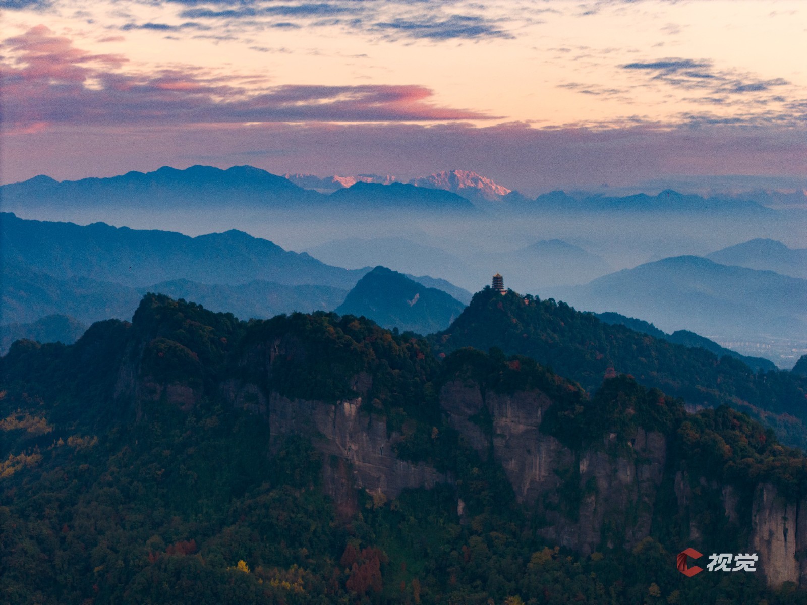 11月15日晨,在都江堰青城山遥望雪山,如同水墨画卷。C视觉签约摄影师 周新联