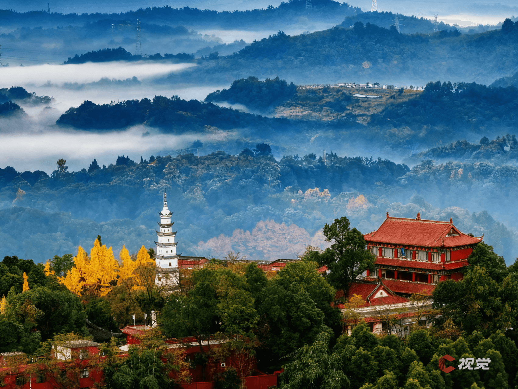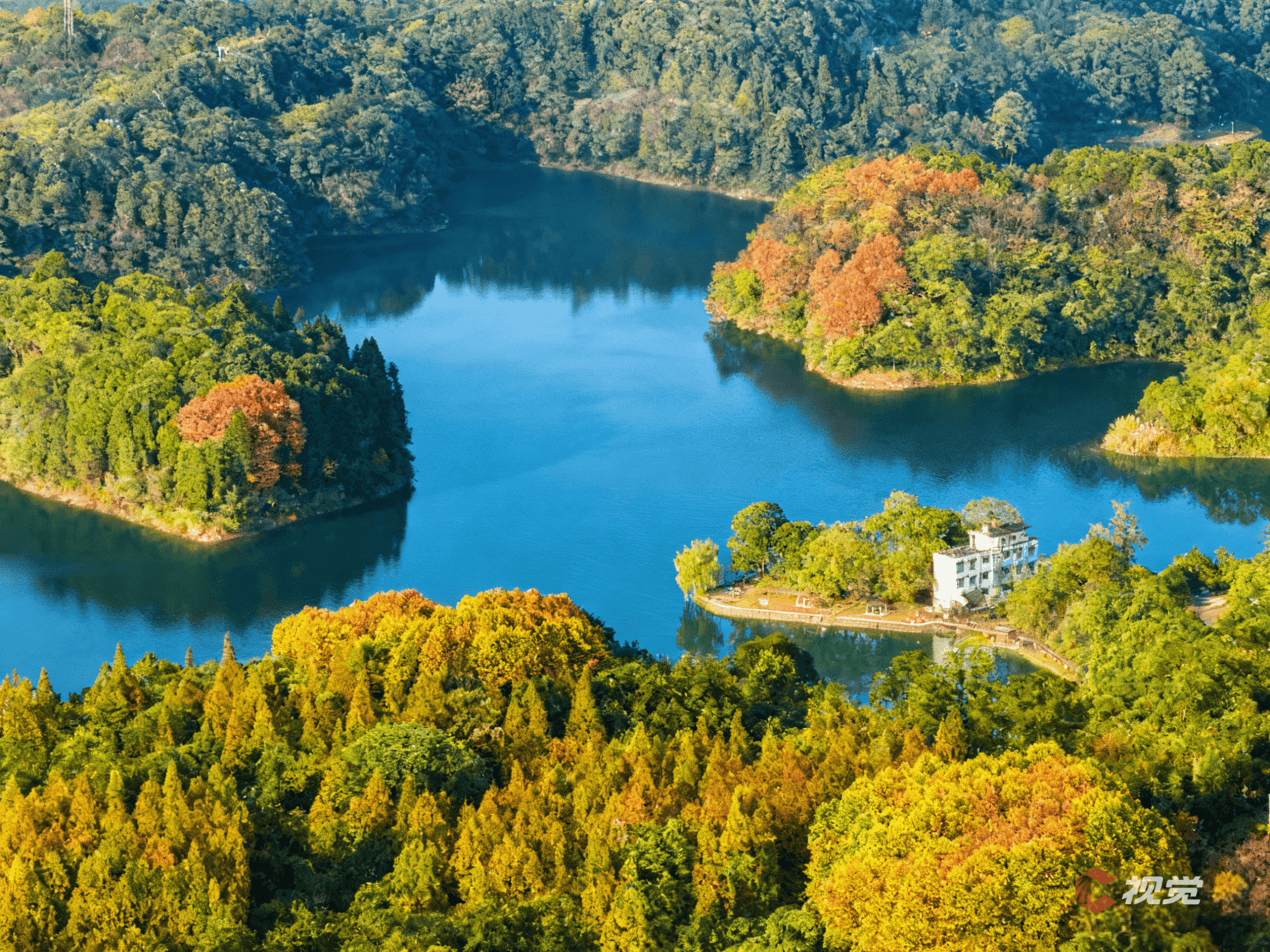11月15日晨,在崇州白塔湖,彩林尽染,与层叠山峦构成了一幅乡村美景画卷。C视觉签约摄影师 朱志宏