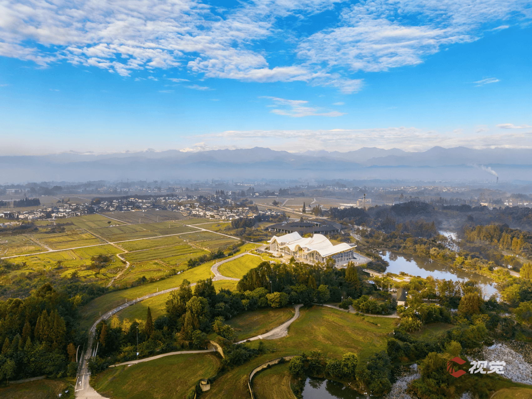 11月15日,在崇州天府国际慢城,雪山在云端显露真容,乡野阡陌交错,秀美如画。C视觉签约摄影师 朱志宏