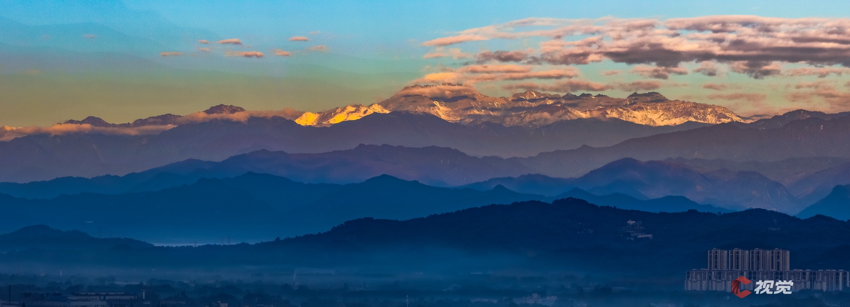 11月15日,在大邑县遥望西岭雪山,晨光照耀山体如银带横亘天际,勾勒出一幅 “城山相契,雪色生晖”的诗意画。C视觉签约摄影师 黄加荣