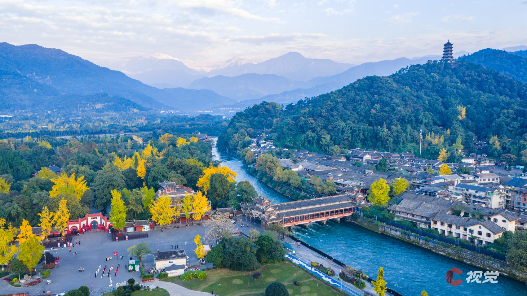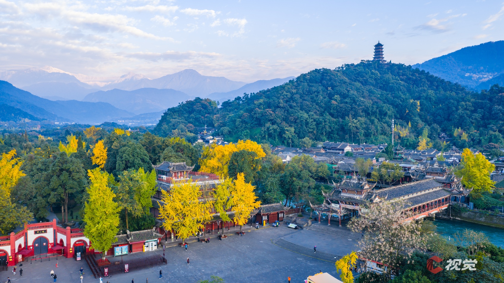 11月15日,都江堰景区银杏染黄,雪山皑皑,如同初冬童话世界。C视觉签约摄影师 韦洪涛