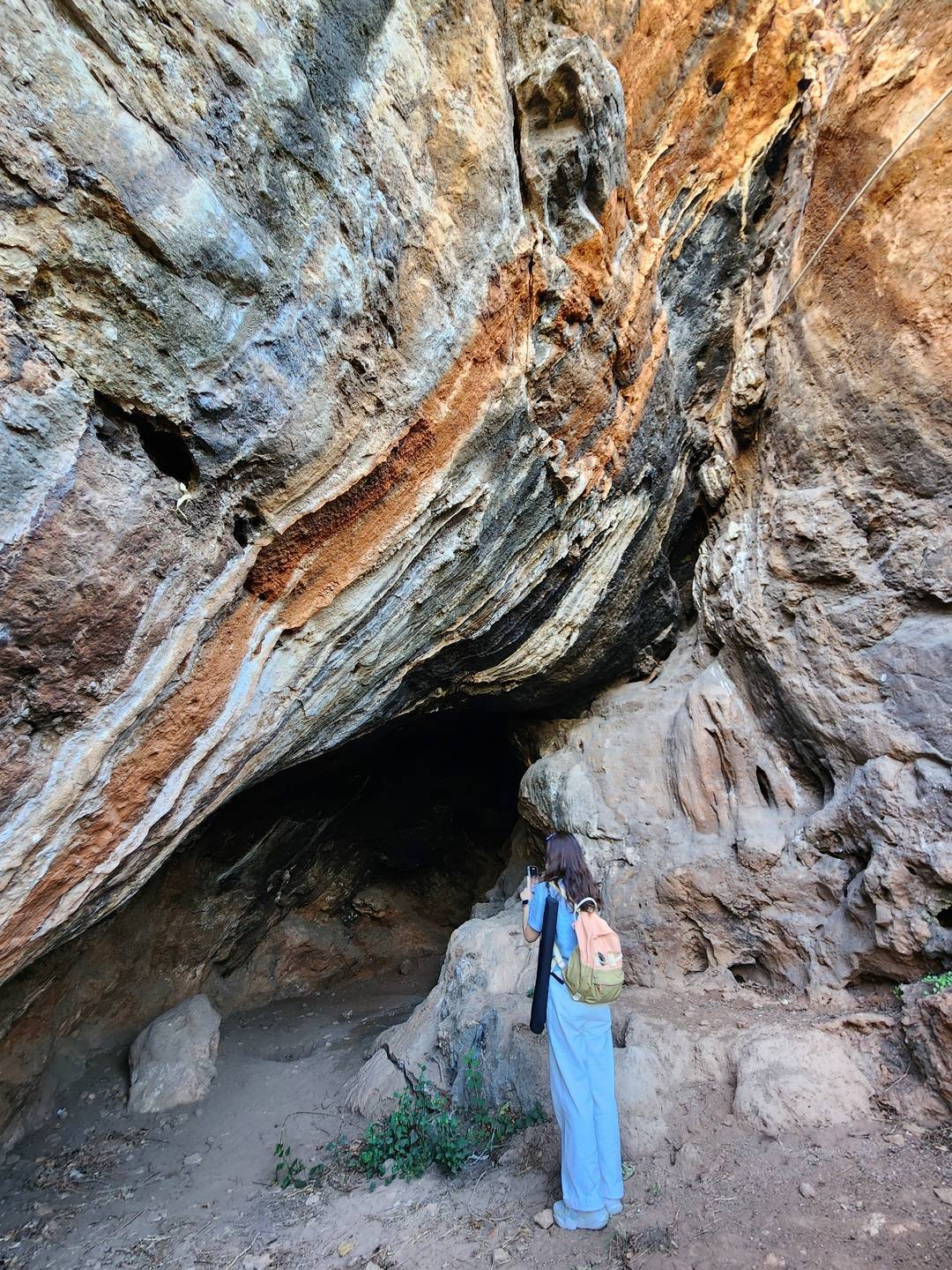 沿着石梯往下走,路的尽头,出现一个三角形的石灰岩溶洞,回龙湾洞穴遗址就在这里。此处四面环山,流水、红砂、芒硝……在岩壁上留下黑白红黄四种颜色。