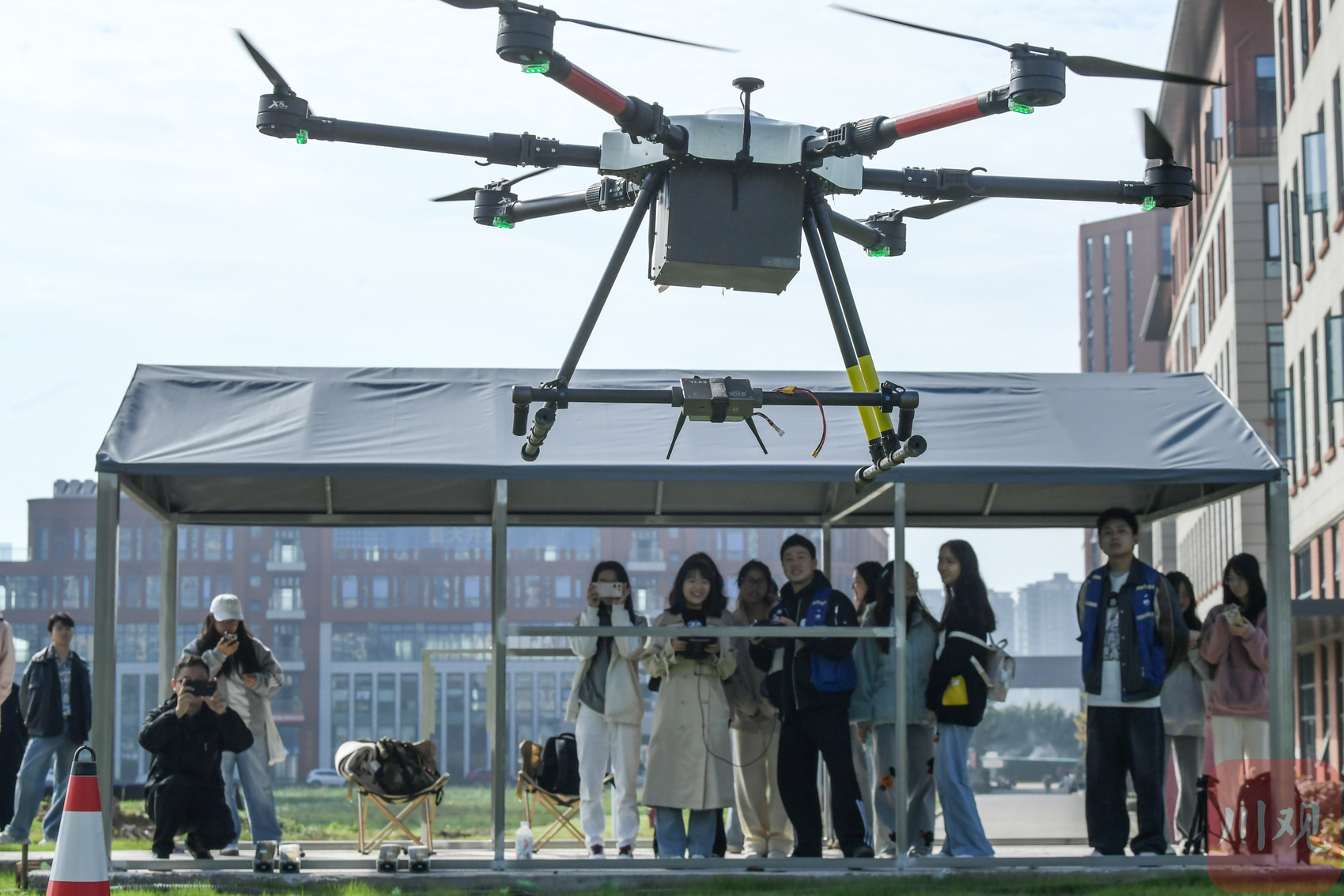 2025年11月15日,成都市双流区的四川极炽联空科技有限公司低空经济全链条研学基地,西南民族大学经济学院的大学生在无人机老师的操作下学习相关操作技能。