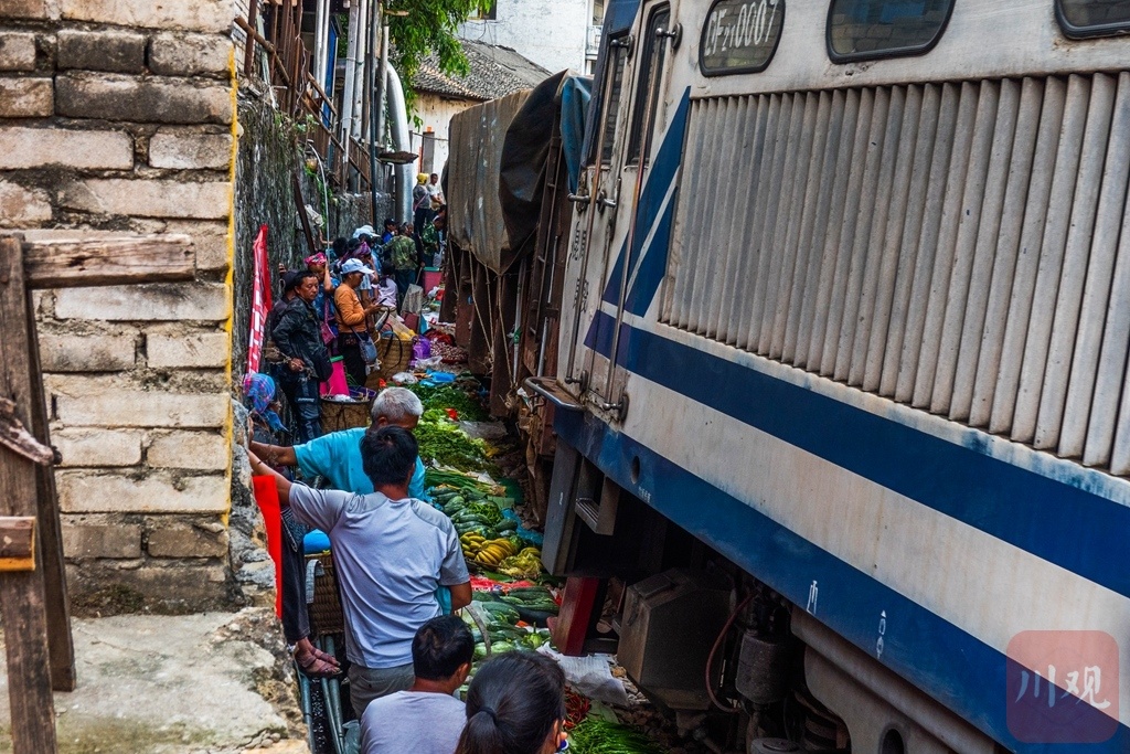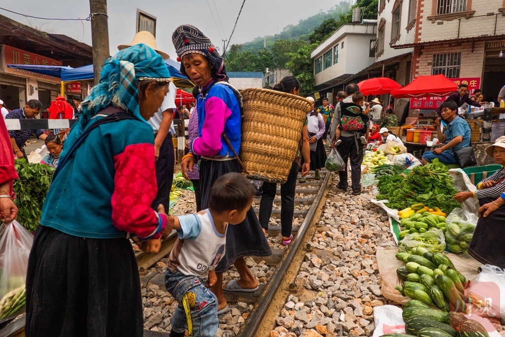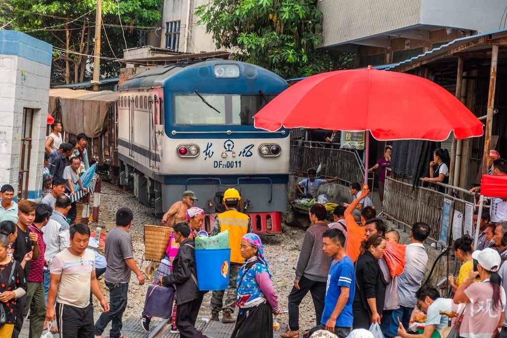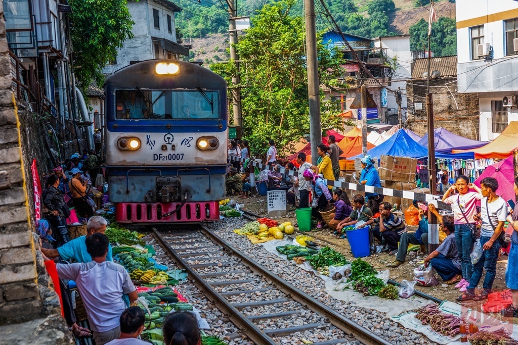 拍摄攻略:每周一的原生态赶集日,苗族群众身着艳服饰在铁路两侧交易,火车经过时避让的独特场景。拍摄技巧:提前1小时到场蹲守,用高速快门抓拍避让瞬间;中焦镜头记录交易神态、蔬果摊位的色彩层次,融入铁路轨道线条。最佳时段:上午9点前(集市热闹),关注9:30-10:30火车经过时段。