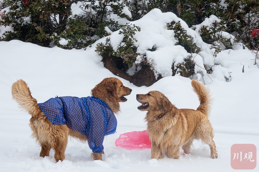 2022年4月6日,云南迪庆德钦,雪地中一对小狗嬉戏。
