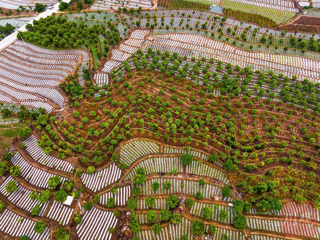 2023年10月7日,云南保山隆阳新寨村,咖啡树、芒果树、豆角田交相辉映。