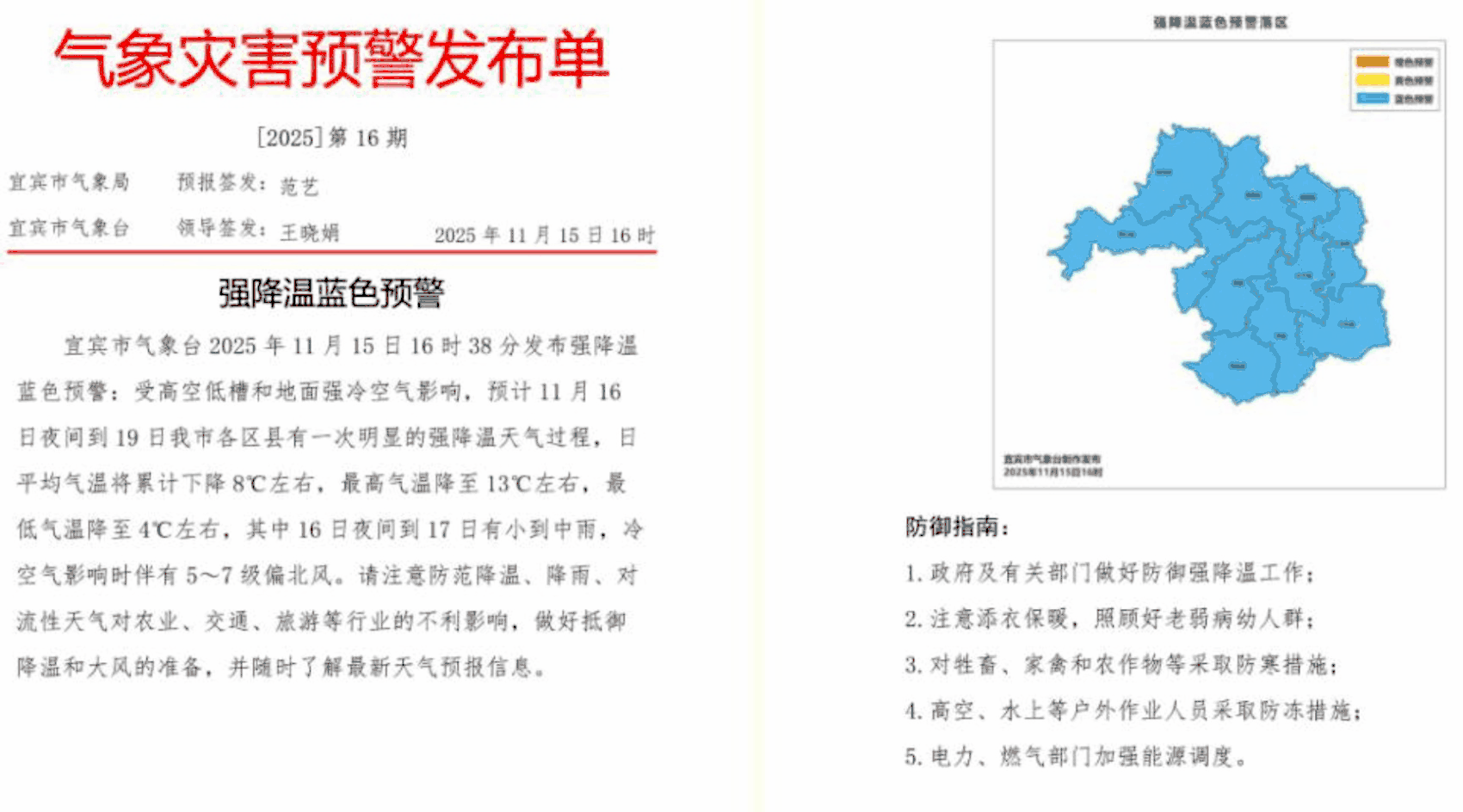 11月16日16时,四川省气象台发布强降温蓝色预警: