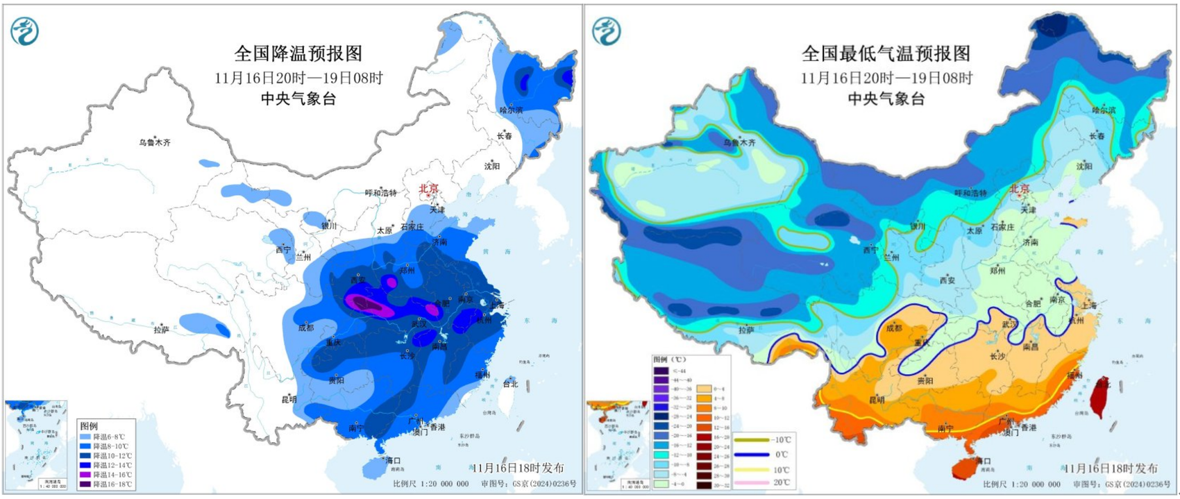 这次强降温主要受强冷空气影响所致。这股强冷空气有多厉害?中央气象台预计,11月16日至18日,我国中东部地区日平均气温或最低气温普遍下降6~10℃,陕西南部、重庆北部、河南西部、湖北北部等地下降12~14℃,局地降温可超过14℃。