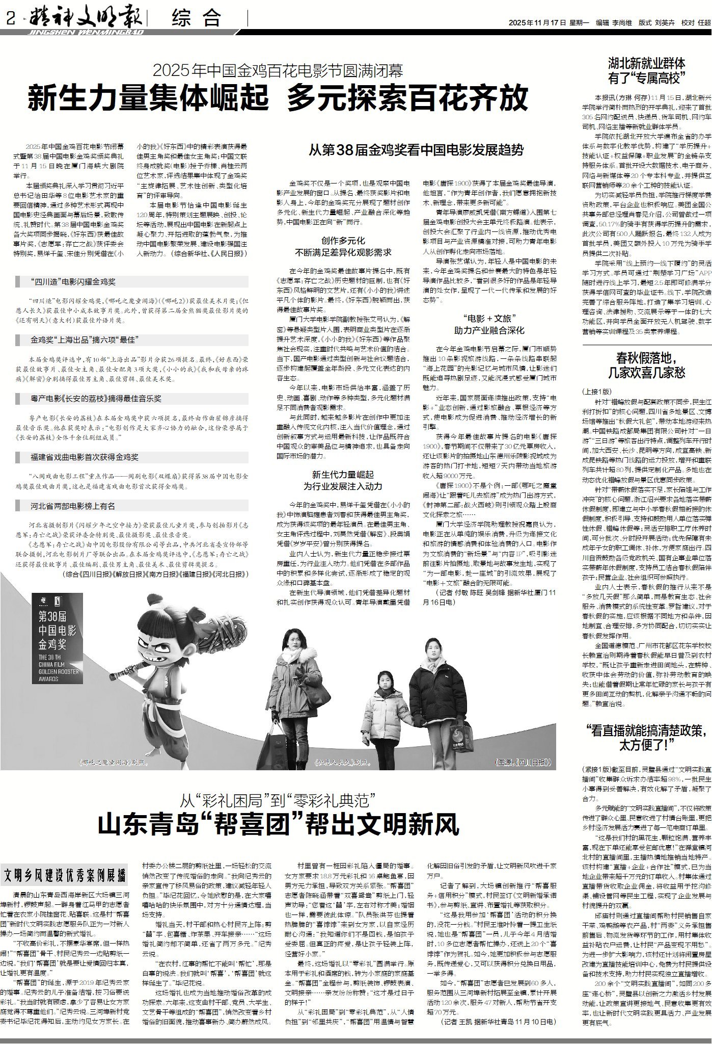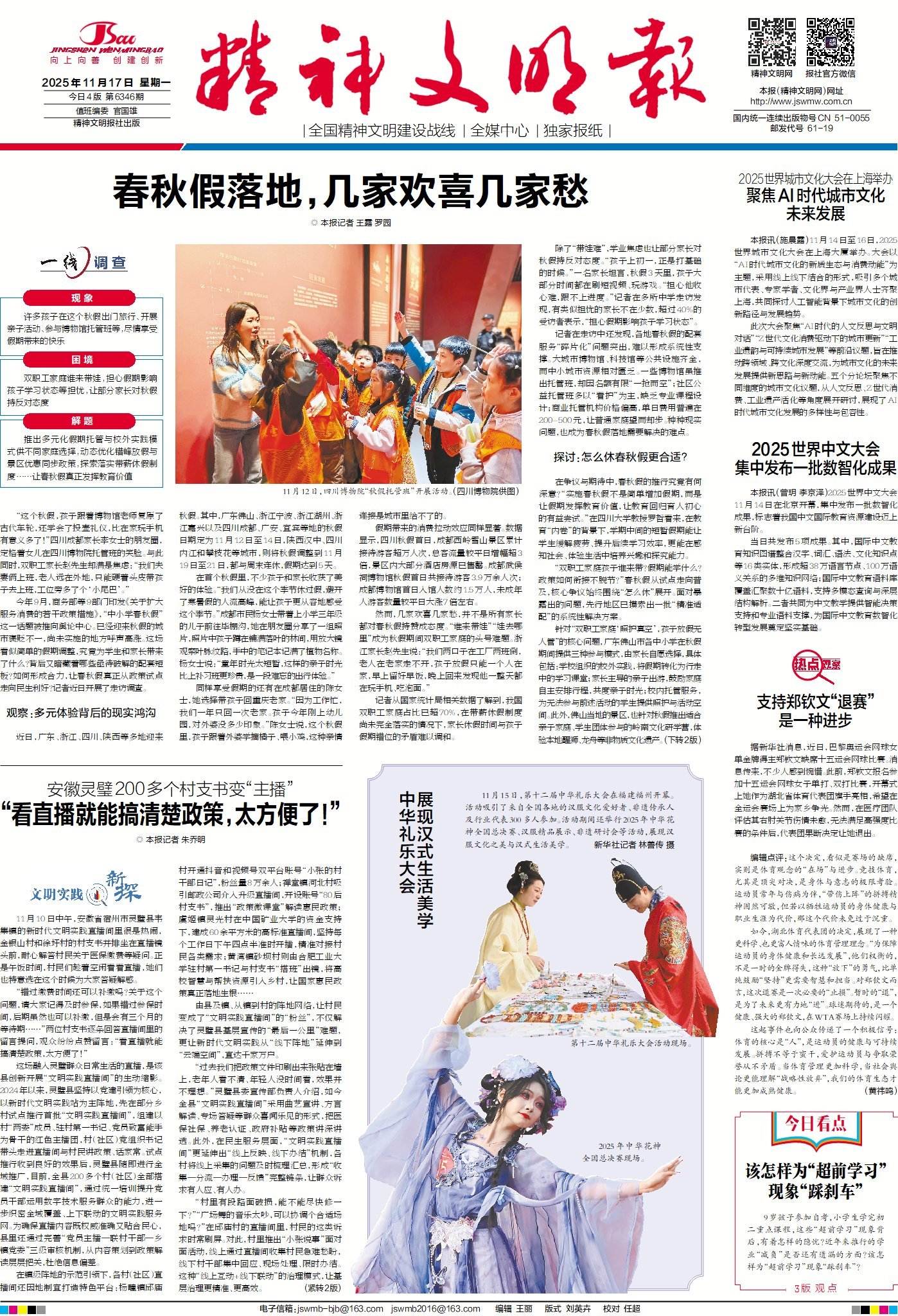 今日版面“早”知道:1版《一线调查》直击“秋假初体验”,探讨如何让春秋假真正发挥教育价值;《热点观察》聚焦郑钦文伤退十五运会;2版《文明乡风建设优秀案例展播》带你走进山东青岛西海岸新区大场镇三河埠新村,看“帮喜团”巧解旧俗难题 ;3版《文明棱镜》关注“超前学习”风潮,探究学业“减负”盲区何在、刹车怎踩。更多精彩尽在本期报纸,赶紧看起来!