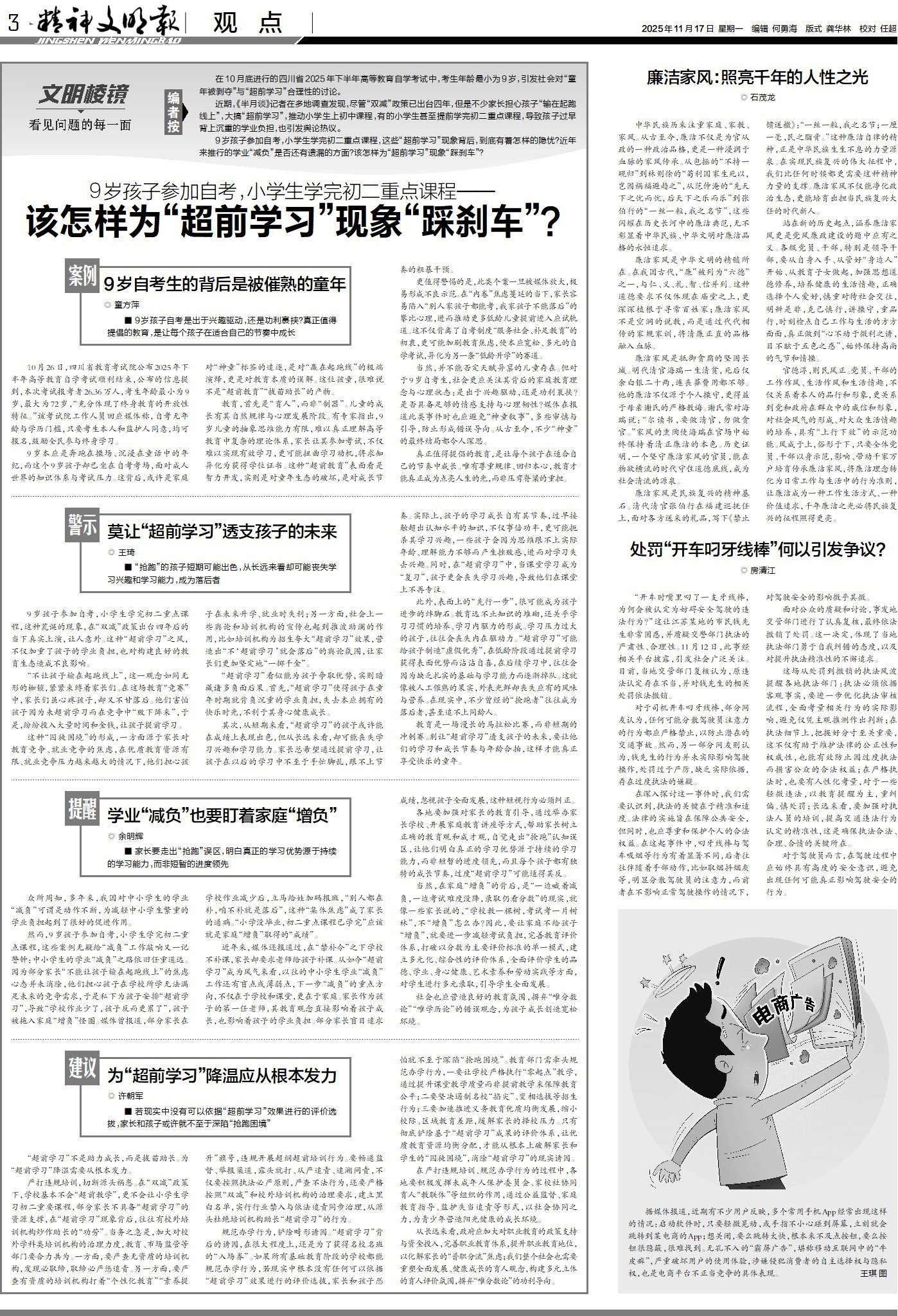 10月底,四川省2025年下半年高等教育自学考试惊现9岁考生;近期,《半月谈》记者在多地调查发现,尽管“双减”政策已出台四年,仍有不少家长大搞“超前学习”,推动小学生上初中课程,有的小学生甚至提前学完初二重点课程。“超前学习”的隐忧何在?学业“减负”是否还有盲区?如何给“超前学习”现象“踩刹车”?来看本报今日观点版“文明棱镜”的讨论。