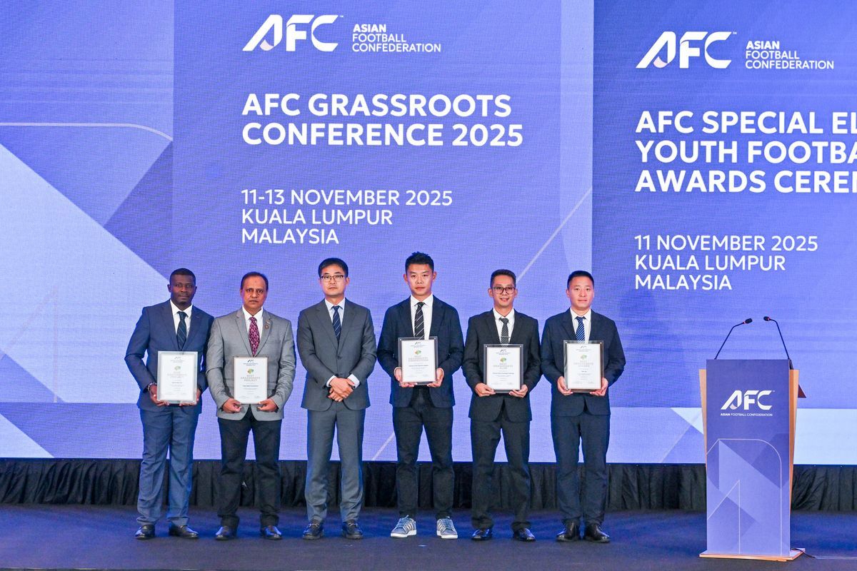 谭杰(右一)荣获“2025亚足联最佳草根足球领导者奖”,颁奖现场。