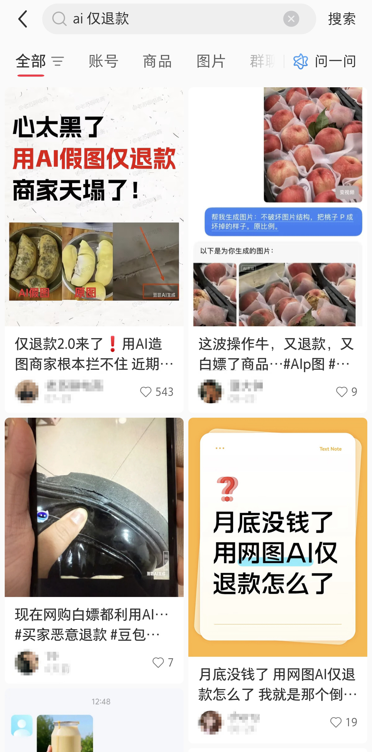 有部分商家发帖反映,买家用来申请“仅退款”的图片AI痕迹明显,甚至未处理掉AI生成的水印。