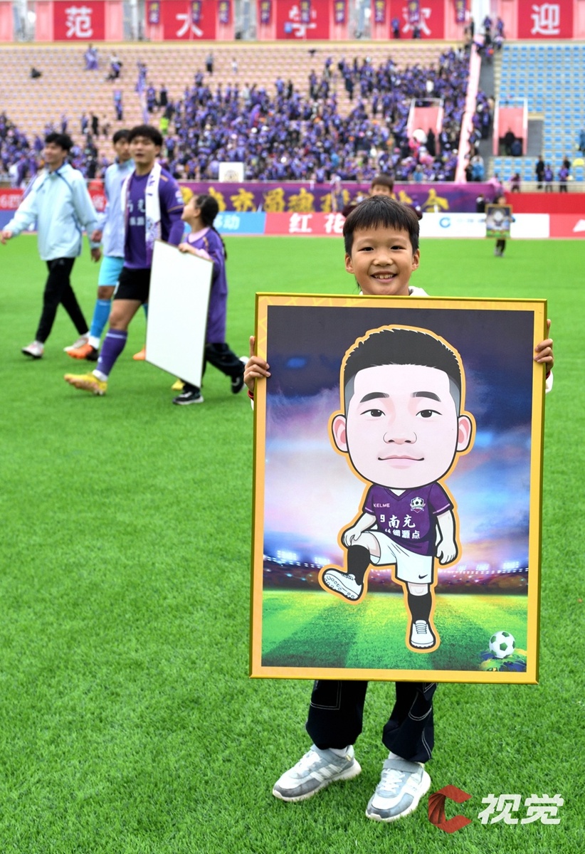 11月15日,“川超”比赛结束后,南充丝绸源点队的一名小球迷举着父亲的卡通肖像,为球队的获胜喝彩。