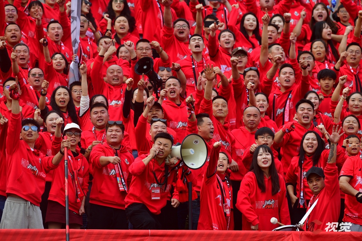 11月9日,自贡灯城燊龙队以2∶0战胜对手,球迷现场欢呼,庆祝球队提前锁定总决赛席位。
