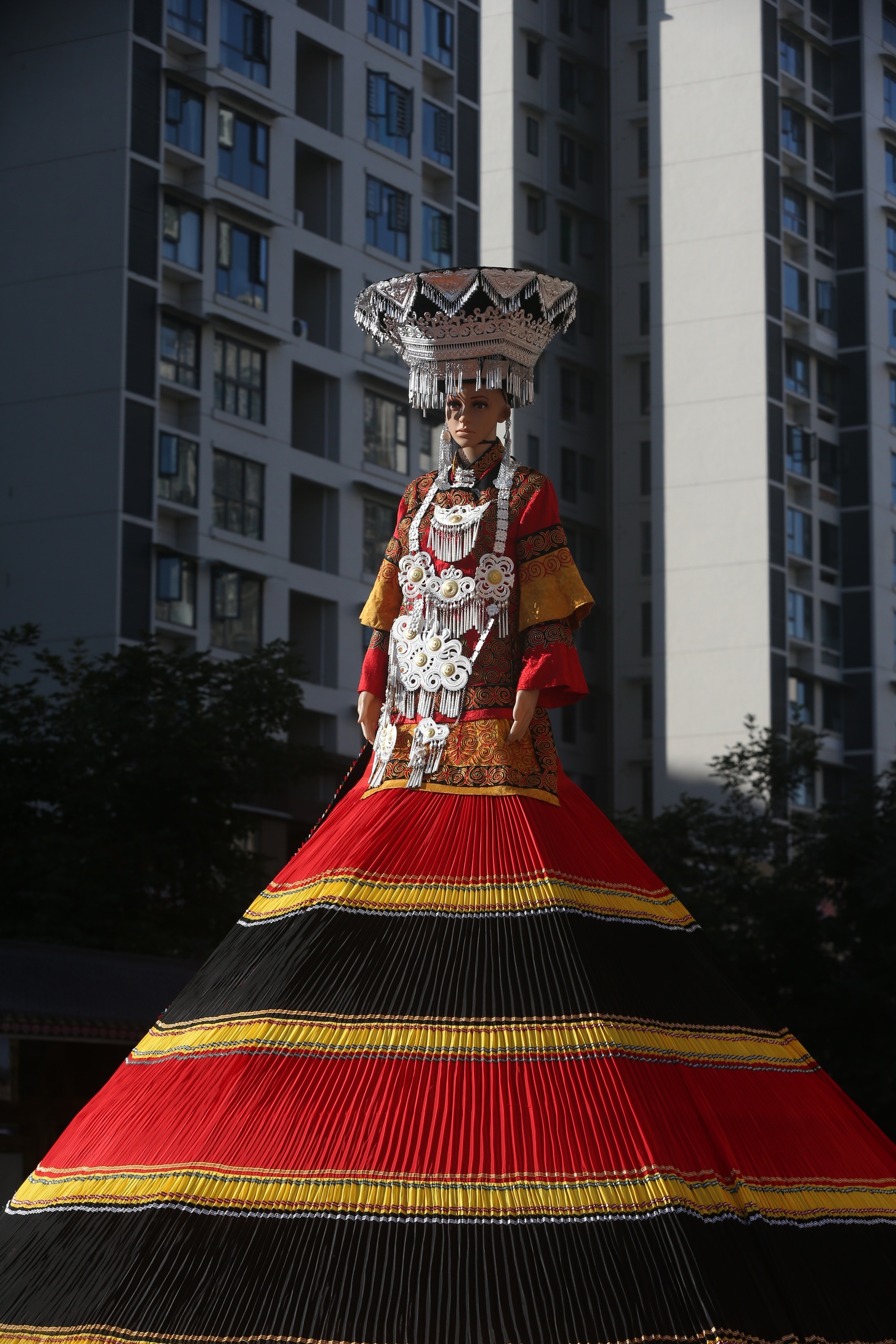 如今,设计师们也在尝试将彝族服饰元素提炼出来,融入现代时装设计。宽松的裙摆、精美的刺绣时常出现在T台上,走向更广阔的世界。