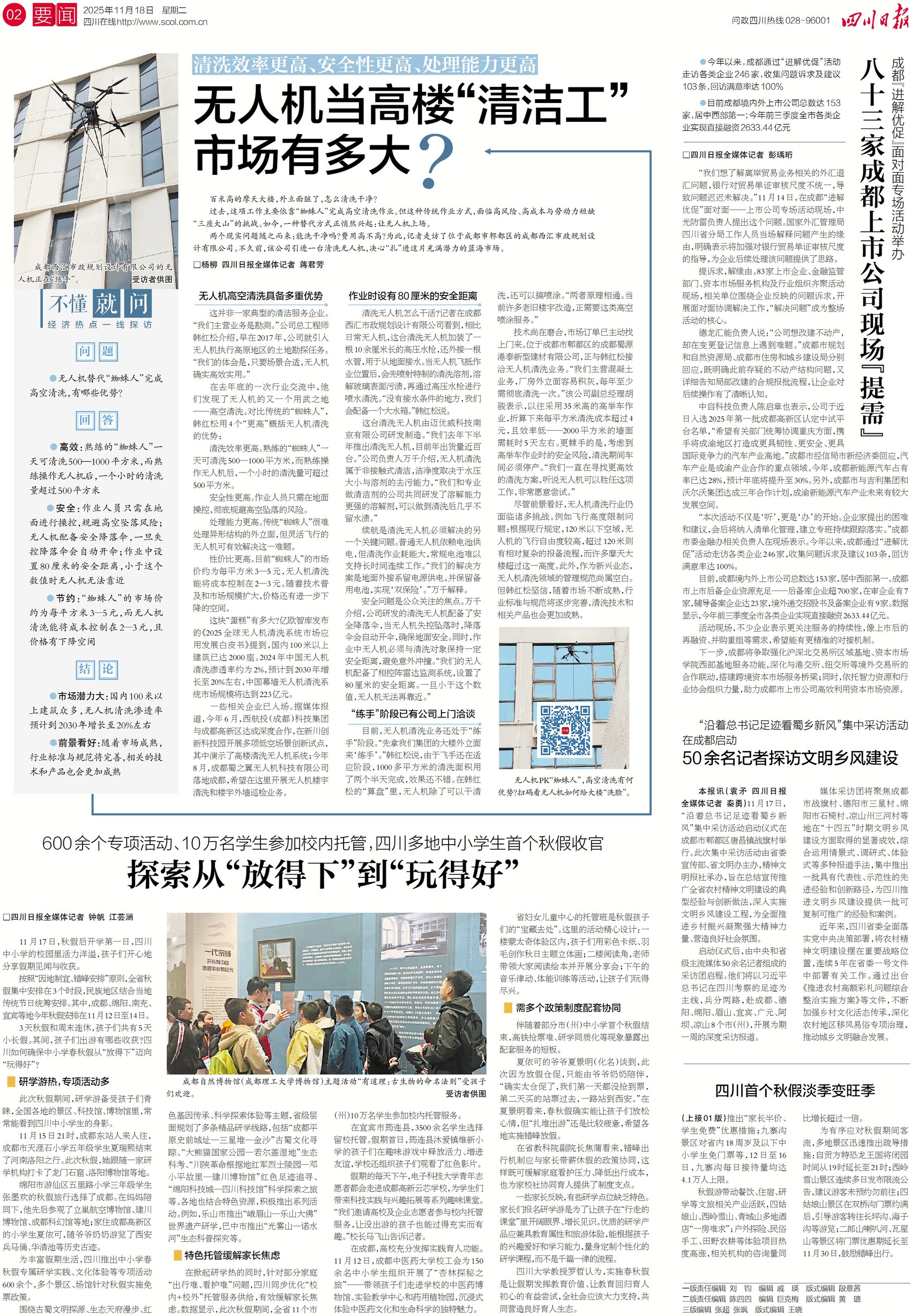 百米高的摩天大楼,外立面怎么洗?过去,这活儿靠“蜘蛛人”悬绳作业,如今,高楼清洗界迎来新“卷王”—— 清洗无人机。不仅效率和性价比更高,还能规避人工作业高空坠落的风险。又快又省又安全的优势,加上国内2000座等着“洗澡”的百米高楼,这片充满潜力的市场蓝海令不少企业心动。当前业务仍在“练手”阶段,已有订单找上门来,待行业标准与规范逐步完善,实操起来又将如何?今日二版,让我们“扎”进这片充满潜力的蓝海市场一探究竟。